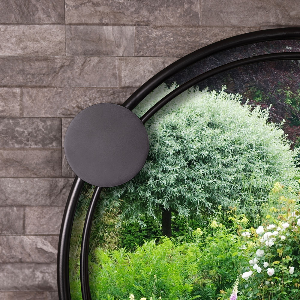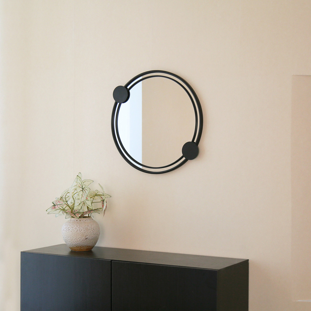 The Warsaw Black Dotted Round Wall Mirror: A stylish and functional accent for your home, indoors or out. Its timeless design creates an illusion of spaciousness, perfect for smaller rooms. The shatterproof finish ensures safety.