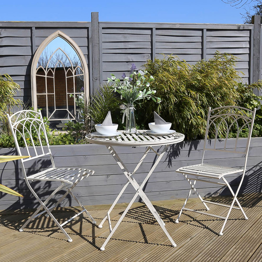 Enjoy al fresco dining with this charming Charles Bentley white wrought iron bistro set. Perfect for smaller gardens, this lightweight yet sturdy two-seater set features a foldable table and chairs for easy storage and transportation. The set includes two chairs and one table. Dimensions: Table: H75 x Dia.70cm, Chairs: H92 x D54.5 x W42.5cm. Keep your bistro set looking its best with one of our durable, waterproof garden furniture covers – find your perfect fit from our wide range of heavy-duty options.
