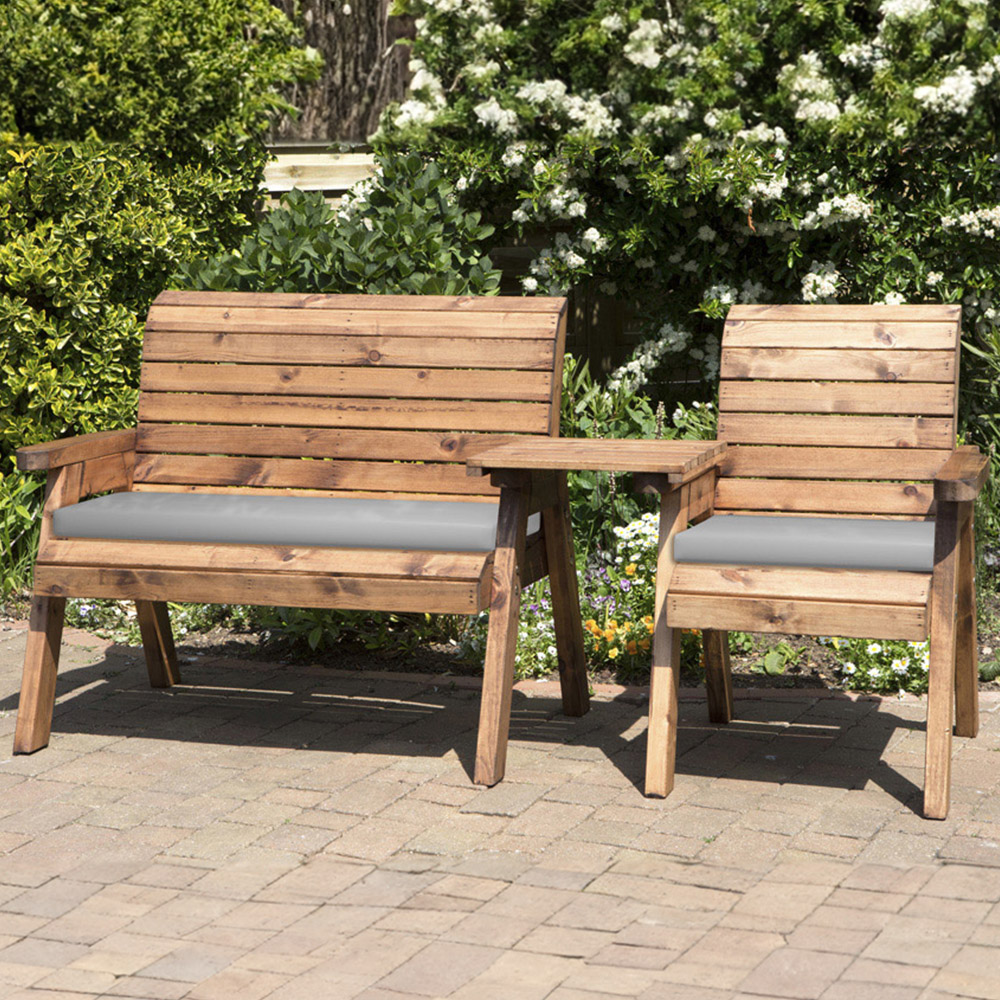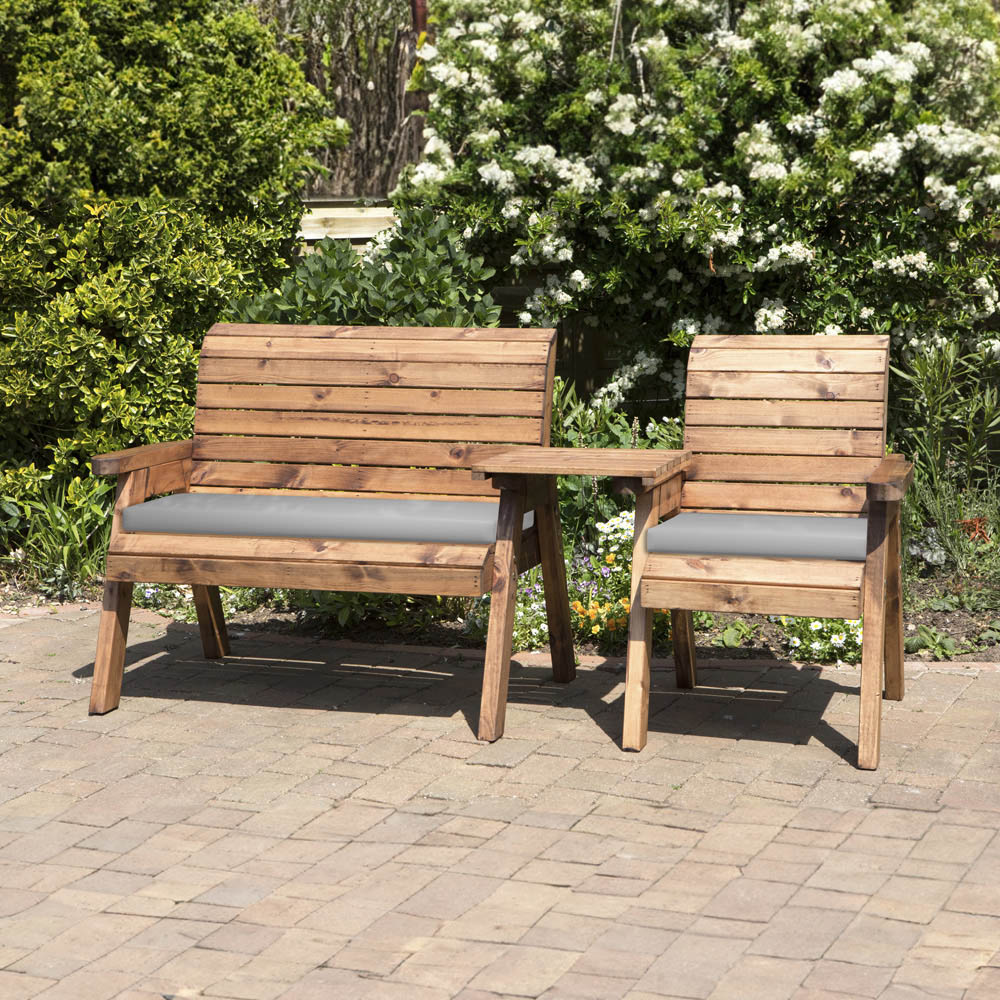Indulge in the quintessential English garden experience with the Charles Taylor three-seater grey companion set. This charming design unites comfort and enduring style, featuring a single armchair, a two-seater bench, and a convenient removable centre tray. Crafted from sustainably sourced FSC wood, this hand-finished set is built to last, backed by a 10-year rot-free guarantee. Weather-resistant with an oil-based, water-repellent preservative and rustproof galvanised zinc bolts, it's designed to withstand the elements. Enjoy a relaxing 460mm seat height, with ample space provided by the armchair's 510mm and bench's 1020mm internal arm widths. Supporting weights of up to 130kg (armchair) and 200kg (bench), this set includes fitted covers and cushions for ultimate comfort. Our white-glove delivery service ensures stress-free assembly and packaging removal. Protect your investment with our selection of durable garden furniture covers.