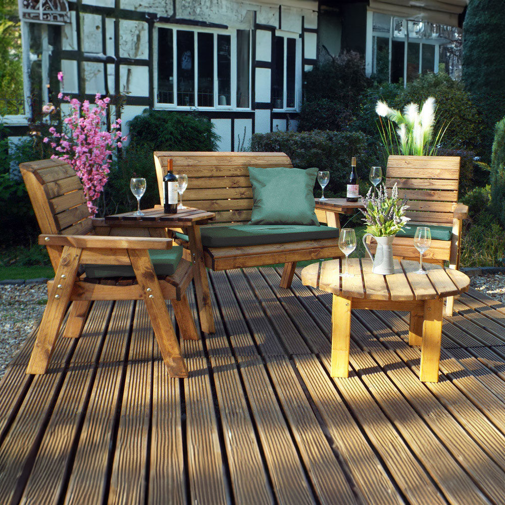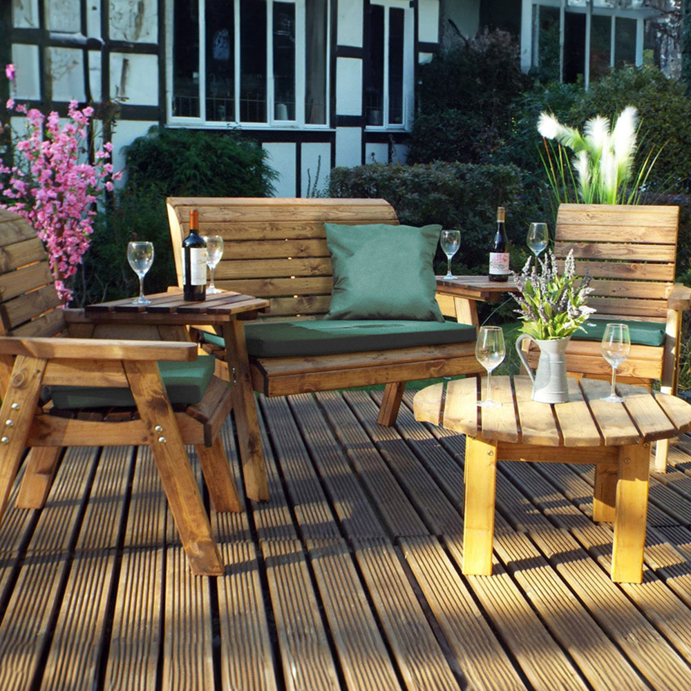 Create a charming outdoor haven with the Charles Taylor Four Seater Round Set. This classic English design features two armchairs, a two-seater bench, and a round coffee table, all crafted from sustainably sourced FSC wood. Enjoy the added convenience of two removable angled centre trays and relax in comfort on the three fitted green cushions. Built to last, this British-made set boasts a 10-year rot-free guarantee, rustproof galvanised zinc bolting, and a water-repellent preservative treatment. With a weight limit of 130kg per chair and 200kg for the bench, and dimensions of 510mm internal arm width on the chairs, 1020mm on the bench, and a 460mm seat height, this set offers both style and practicality. Our white-glove delivery service ensures effortless setup and packaging removal. Protect your investment with one of our durable, waterproof garden furniture covers, find the perfect fit from our wide range.