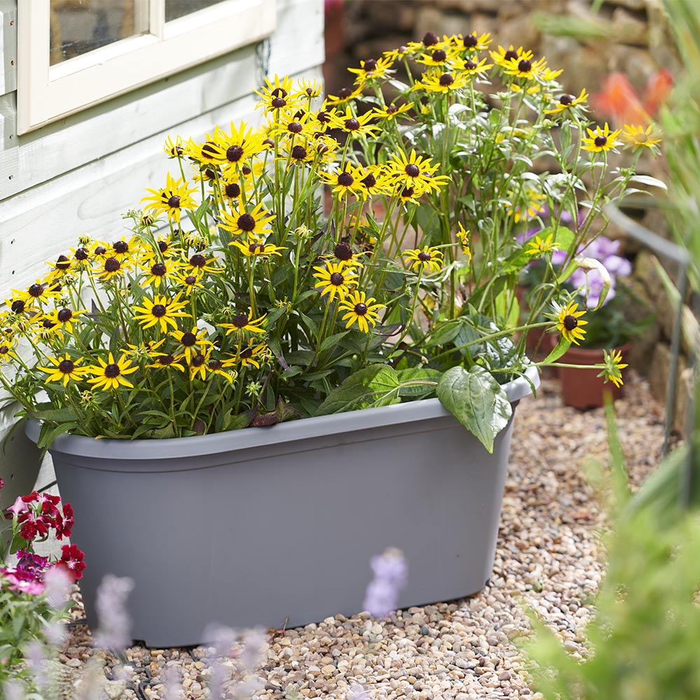 Grow your favourite plants in this stylish and durable 60cm long Grey trough planter. Made from polypropylene plastic, this 15 litre planter is perfect for indoor and outdoor use, including greenhouses and outbuildings. Its wide rim makes it easy to move and helps keep pests at bay. Small feet lift the pot for better airflow to the roots, while pre-marked drainage points in the base allow for easy customisation. Made from 30% recycled plastic, this weather-resistant and UV-stable planter is designed for years of use and is recyclable. It',s also compatible with our full range of accessories. Dimensions: D 30.3 x W 60 x H 24.1cm. Note: Please take care when piercing drainage holes.