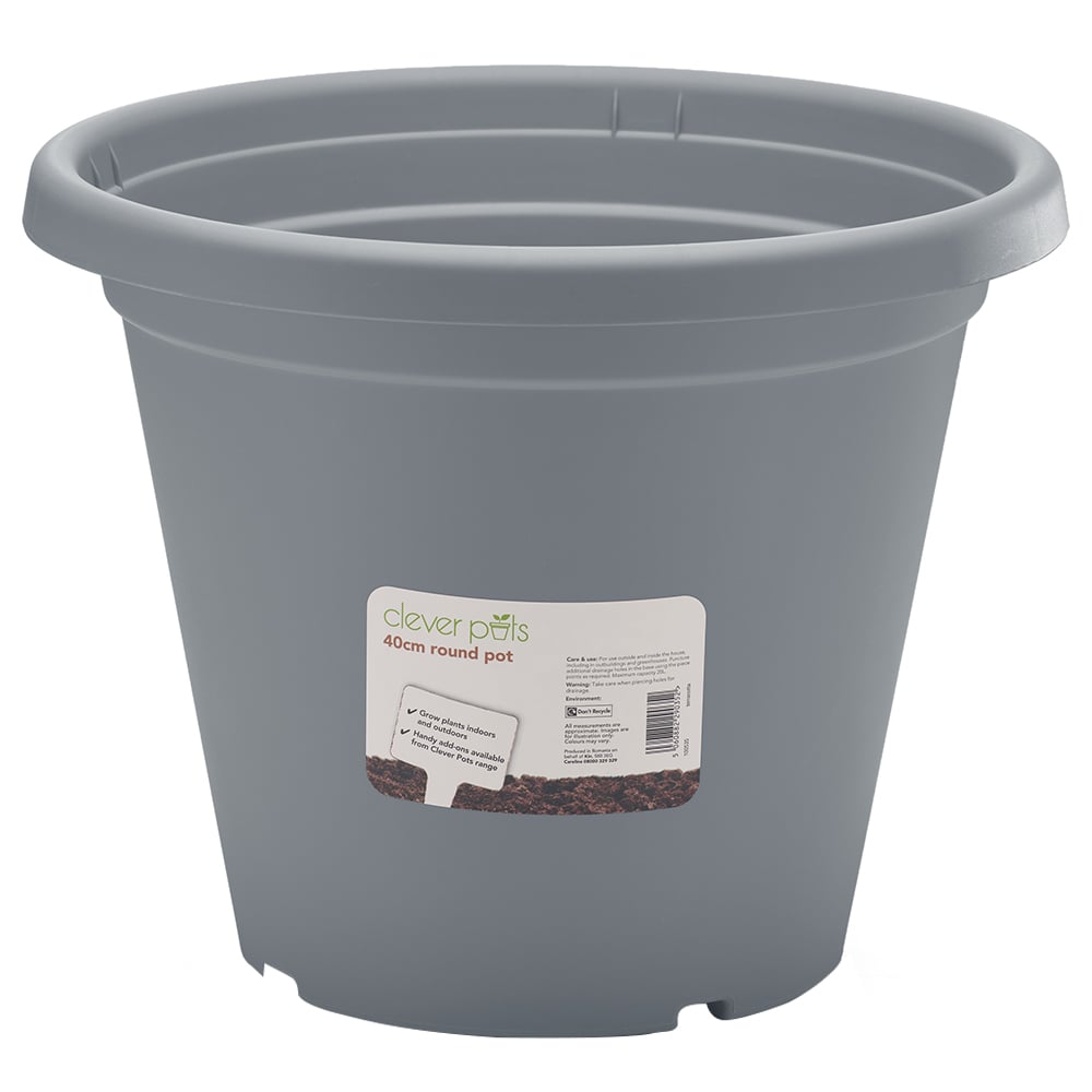 Grow bigger and better with this durable 40cm round plant pot. Perfect for larger plants, its lightweight yet robust design ensures years of use. The weather-resistant, UV stable grey finish (also available in terracotta) is ideal for outdoor spaces. Made from 30% recycled Polypropylene plastic, this pot is both reusable and recyclable. A wide rim makes moving easy while deterring pests, and small feet improve air circulation for healthy roots. Drainage holes can be easily created using the pre-marked points in the base. Expand your gardening potential with our compatible accessories: plant pot wheels, feet, cane supports, and custom-fit reservoirs for longer-lasting hydration. Dimensions: D 40.3 x W 40.3 x H 32cm. Dia: 40.1cm. Weight: 0.575kg.