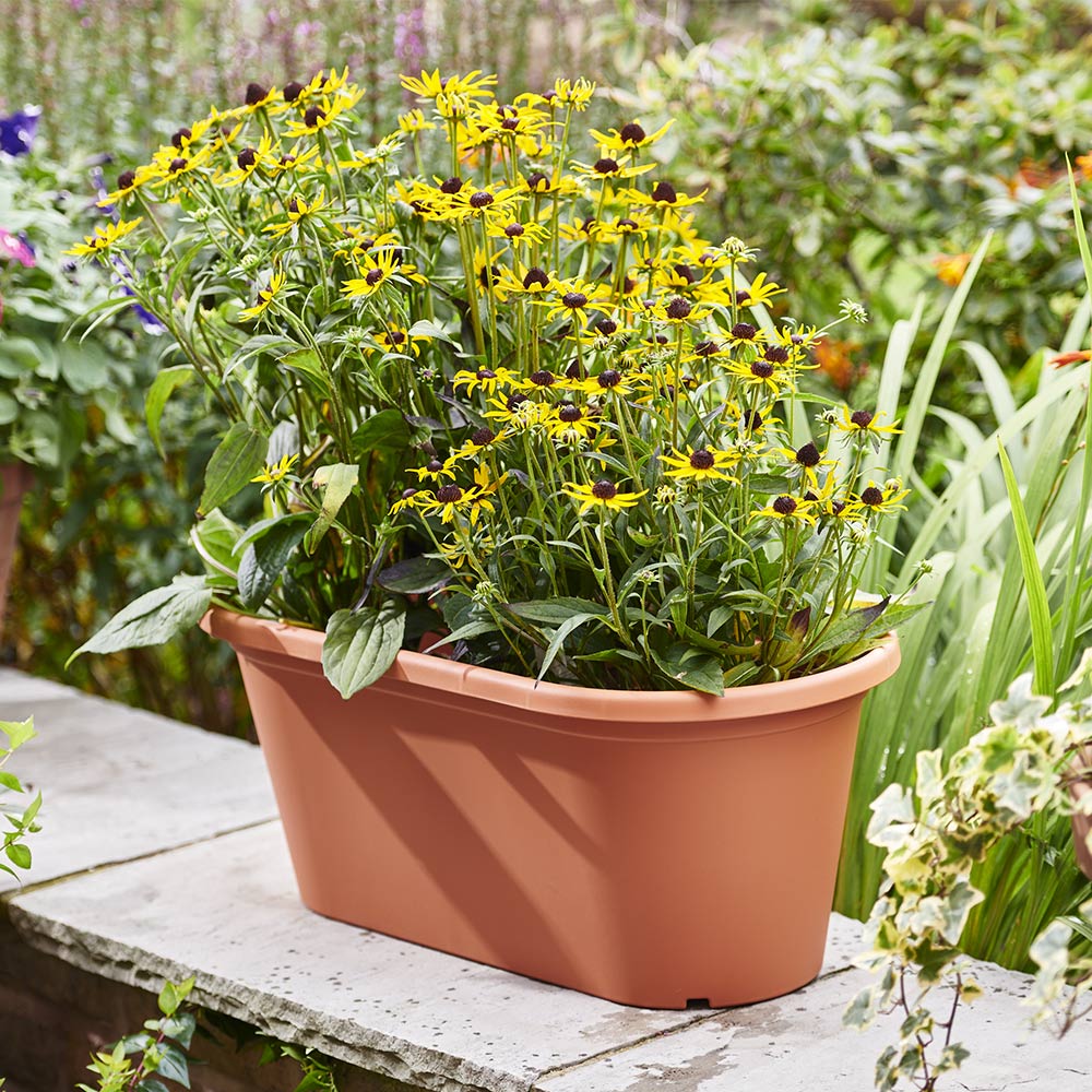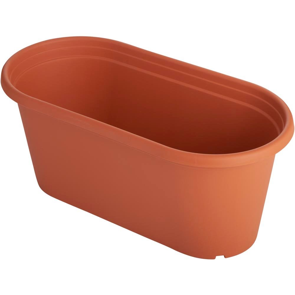 Grow your favourite plants in style with this 60cm long planter. Made from durable polypropylene plastic (30% recycled), this terracotta or grey trough is perfect for indoor and outdoor use, including greenhouses and outbuildings. Its wide rim makes it easy to move and helps keep slugs and snails at bay, while small feet improve air circulation around the roots. Drainage holes can be added as needed (please take care when piercing). Weather-resistant and UV stable, this planter is designed for long-lasting use and is recyclable. It',s also compatible with our range of accessories. Dimensions: D 30.3 x W 60 x H 24.1cm.