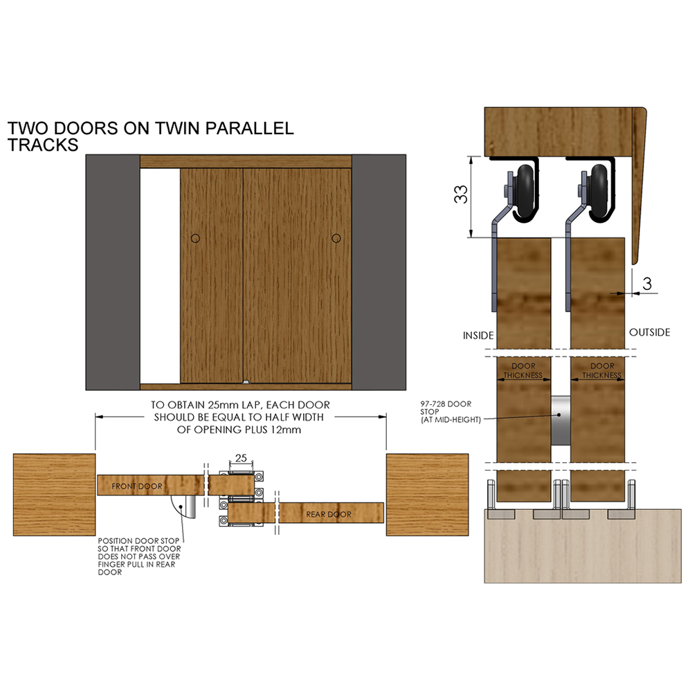 Effortlessly glide open your wardrobe or cupboard doors with the Twin 60 system. This top-hung sliding mechanism is designed for lightweight bi-passing doors, offering flexible spacing options thanks to its individual tracks. Please note: doors are sold separately.