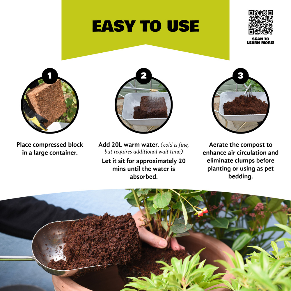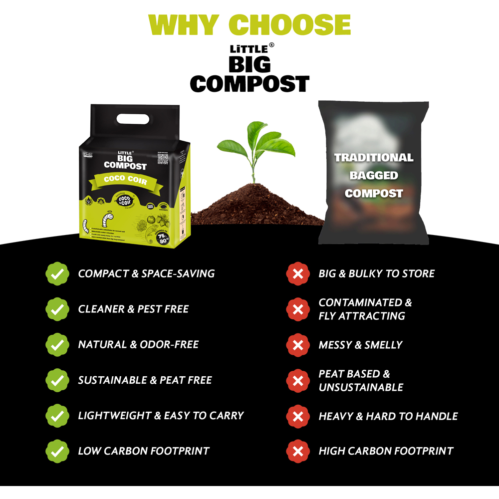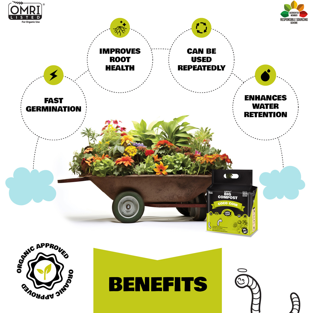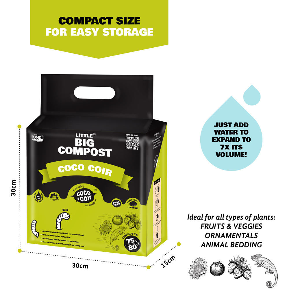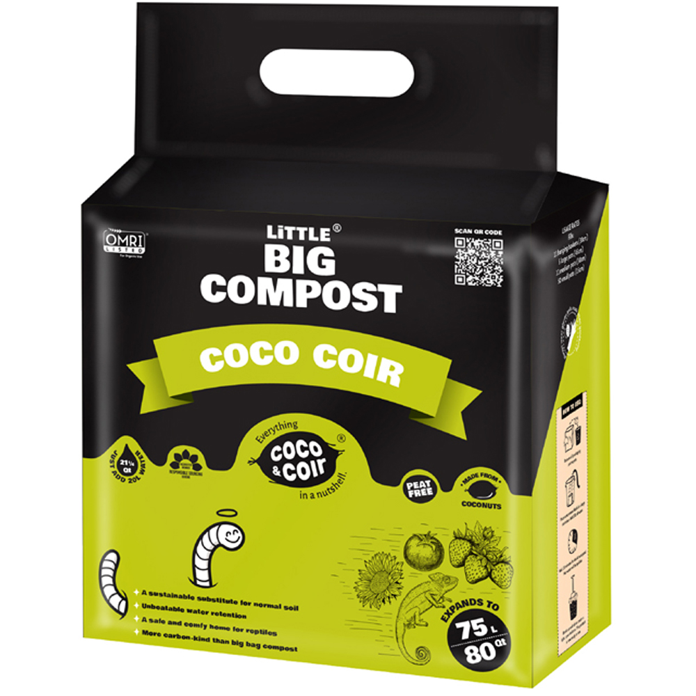 Experience versatile, nutrient-free planting with the Coco & Coir Little Big Compost Coco Coir Compost 75L. Made from 100% natural pith-based coco fibre, this organic compost is perfect for gardening, reptile vivarium's, and even pet bedding. It improves soil structure, boosts aeration and retains water efficiently, ideal for beds and borders. Lightweight and compact before hydration, this compost expands with water, saving storage space and effort. Long-lasting and reusable, it offers a sustainable and practical alternative to traditional heavy bags.