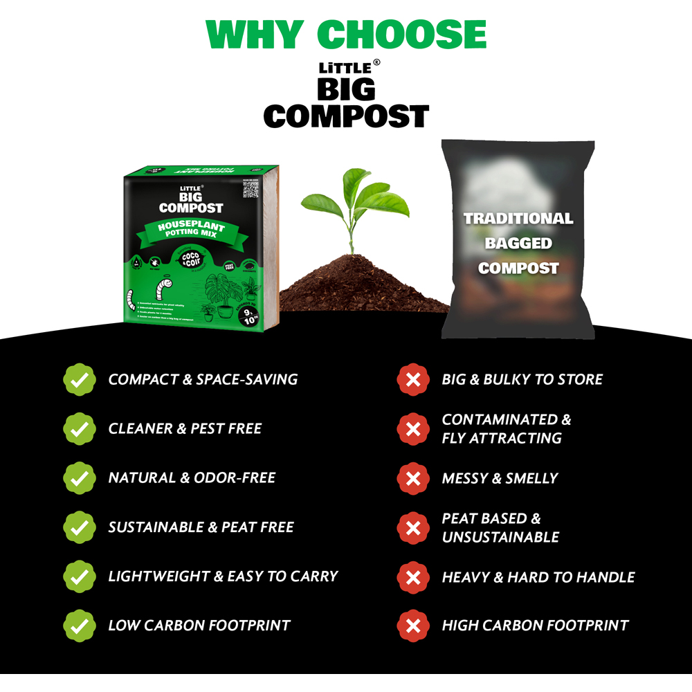Nurture vibrant houseplants with the Coco & Coir Little Big Compost Houseplant Compost 9L. 100% natural, peat-free potting mix, this plant food-enriched potting soil is formulated to support the development of all types of house plants except ericaceous. Enriched with specialist plant food, this coir-based compost supports lush green growth and healthy root development. Its nutrient-rich formula ensures a slow-release 6-month feed once expanded and wet. Naturally processed to deter sciarid flies, it provides a solution for plant lovers seeking strong, thriving houseplants with minimal fuss.