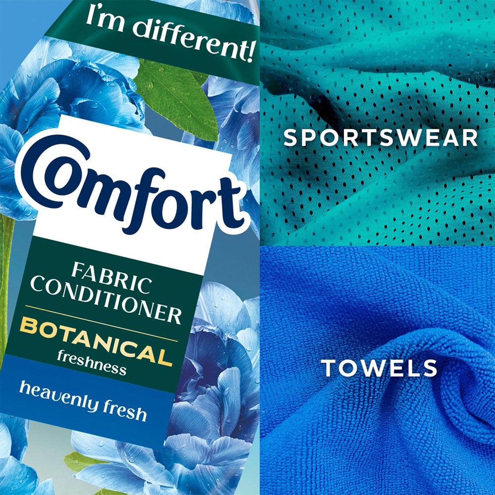 Discover the botanical freshness of Comfort Botanical Fabric Conditioner Heavenly Fresh Softener and bring the scents of nature to your washing. This unique CrystalFresh transparent formula ensures brilliant performance, even in quick and cool cycles. Enjoy the heavenly scent, an enchanting blend of patchouli, violet, and eucalyptus, alongside an irresistibly soft feel for your clothes.
