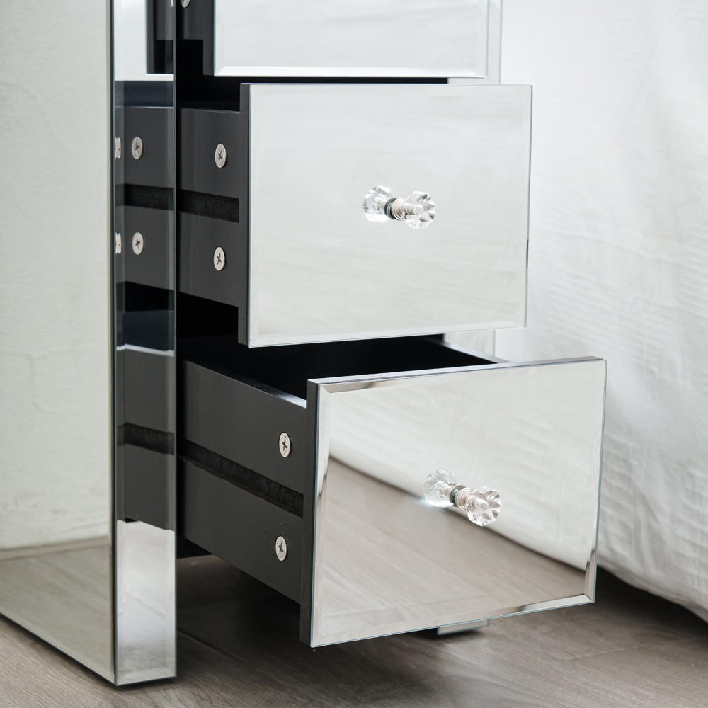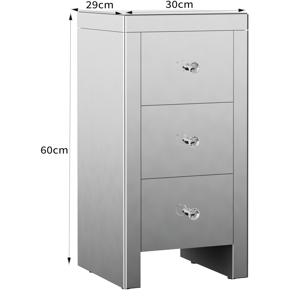 Introduce a touch of glamour to your bedroom with this Comfy Living mirrored bedside table. Its three drawers, each adorned with crystal-style handles, offer a discreet storage solution for your nighttime necessities. The mirrored finish not only adds a sparkle but also cleverly enhances the sense of space and light within the room, making it appear brighter and more spacious. Constructed with quality in mind, this compact bedside table combines practicality with a distinctly elegant aesthetic.
