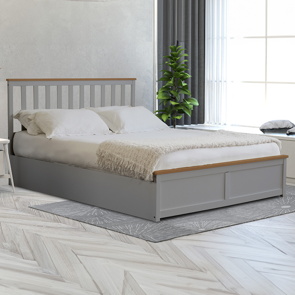 The Comfy Living small double white gas lift ottoman bed frame provides both style and practicality for any bedroom. Finished in whitewash with caramel bars on the head and foot ends, this bed offers an elegant design. Featuring a slatted headboard and low footboard, it combines classic aesthetics with maximum comfort. Gas hydraulic pistons provide effortless access to the generous storage space beneath. This bed frame is designed to accommodate any UK standard 4ft mattress.