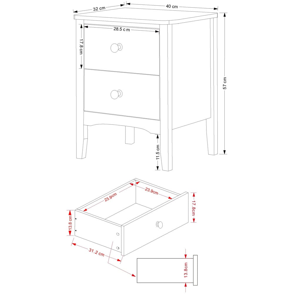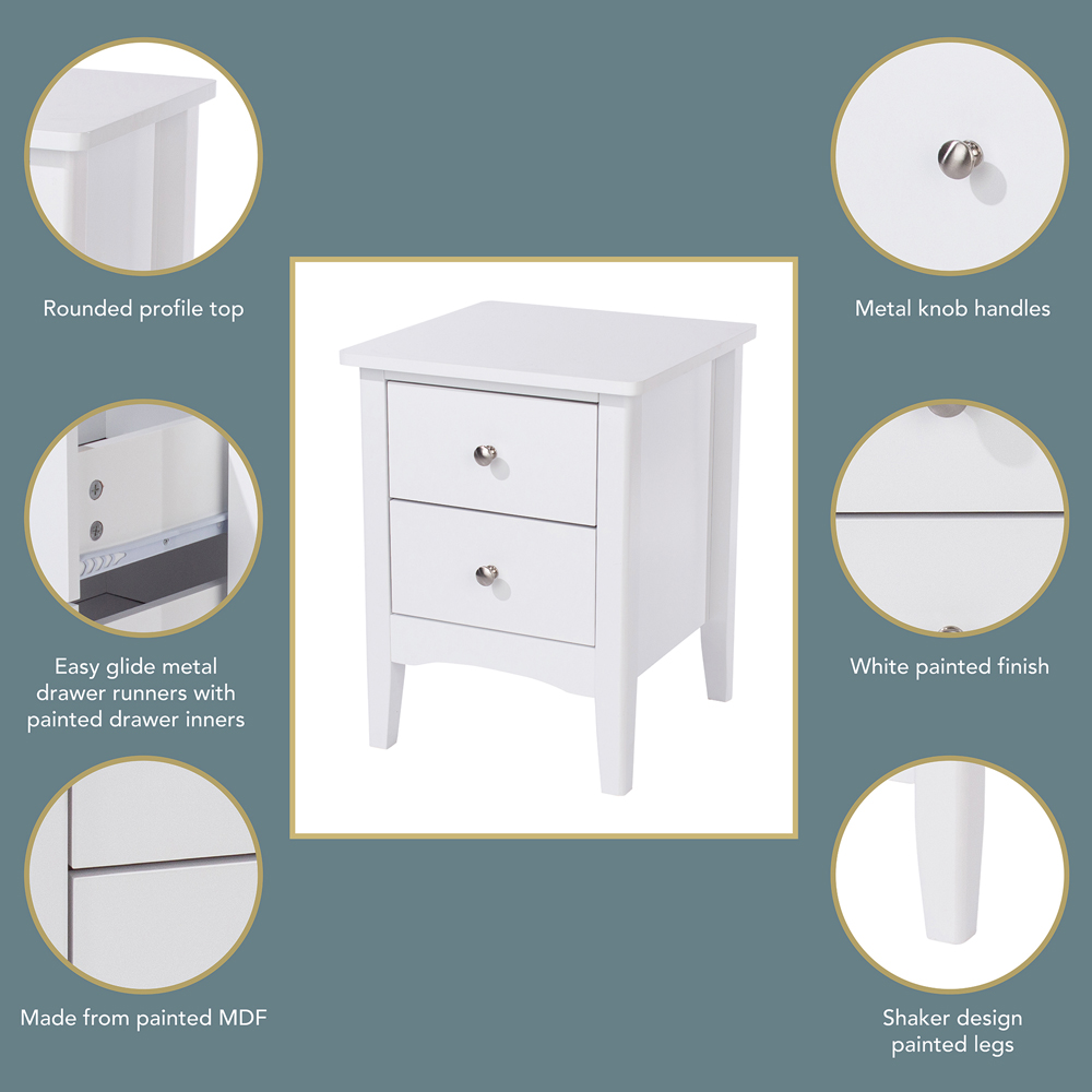 The Como Bedside Storage Cabinet offers elegant bedside storage with its crisp white finish and Shaker-style design. Two smooth-glide drawers, accented with real metal handles, provide easy access to your essentials. Rounded corners add a touch of both style and practicality. Size: H57 x W40 x D32cm. Weight: 11.5kg. Shipping Weight: 12kg.