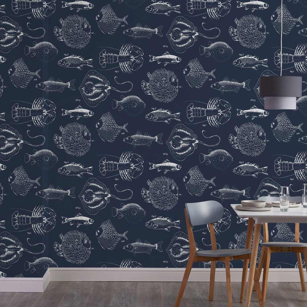 This elegant deep navy wallpaper adds a touch of playful sophistication to your home. Its rich colour evokes the tranquil depths of the ocean, complemented by detailed illustrative drawings. Boasting revolutionary antibacterial properties, this wallpaper from our Contour range is perfect for kitchens and bathrooms, where durability is key. It',s easy to apply (paste the wall), with an offset design match, 64cm repeat, 10m length, and 52cm width.