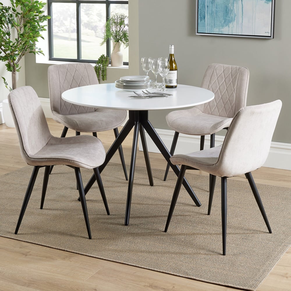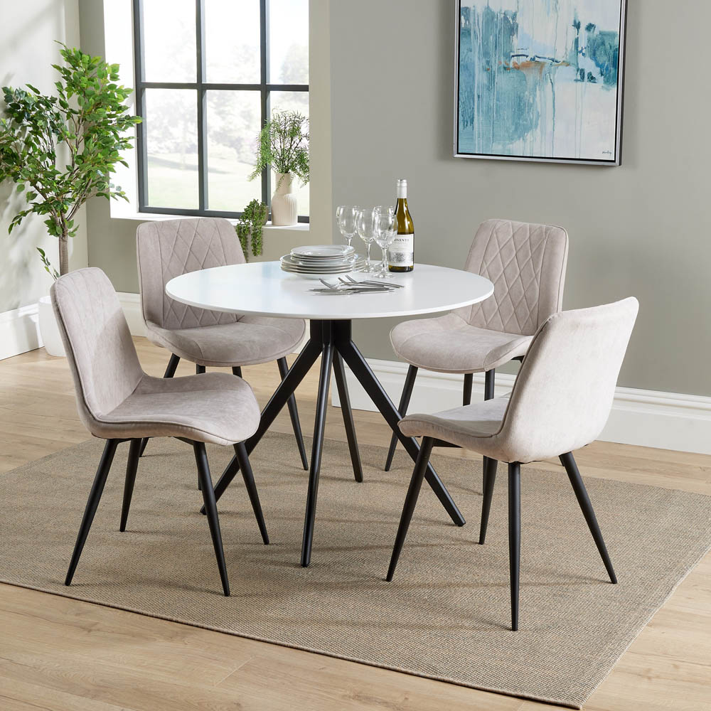 Add modern touch to your dining space with Core Products Aspen White and Natural 4 Seater Round Dining Set. This round dining set features a 100 cm diameter tabletop with a white matte painted finish, supported by a tapered black powder-coated metal pedestal base for a sleek, minimalist industrial look. It includes four stylish chairs with diamond-stitched backs, ergonomically contoured seats, and tapered metal legs for a clean, modern aesthetic. Upholstered in smooth, soft fabric with padded seats, the chairs offer both comfort and elegance. The set is delivered flat-packed with all tools and fittings included for easy home assembly. Each chair supports up to 120 kg.