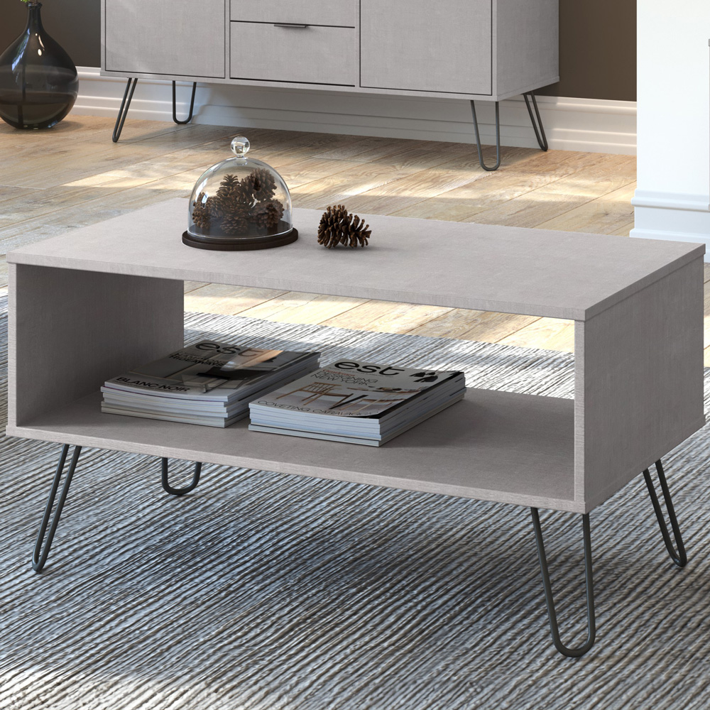 Elevate your living space with the Augusta coffee table. Its grey finish, boasting a textured woodgrain effect, offers a subtly sophisticated aesthetic. The smooth tabletop provides ample surface area, complemented by an open lower shelf for convenient storage. Industrial-style metal hairpin legs complete the design, lending a contemporary feel that seamlessly integrates with both traditional and modern interiors.