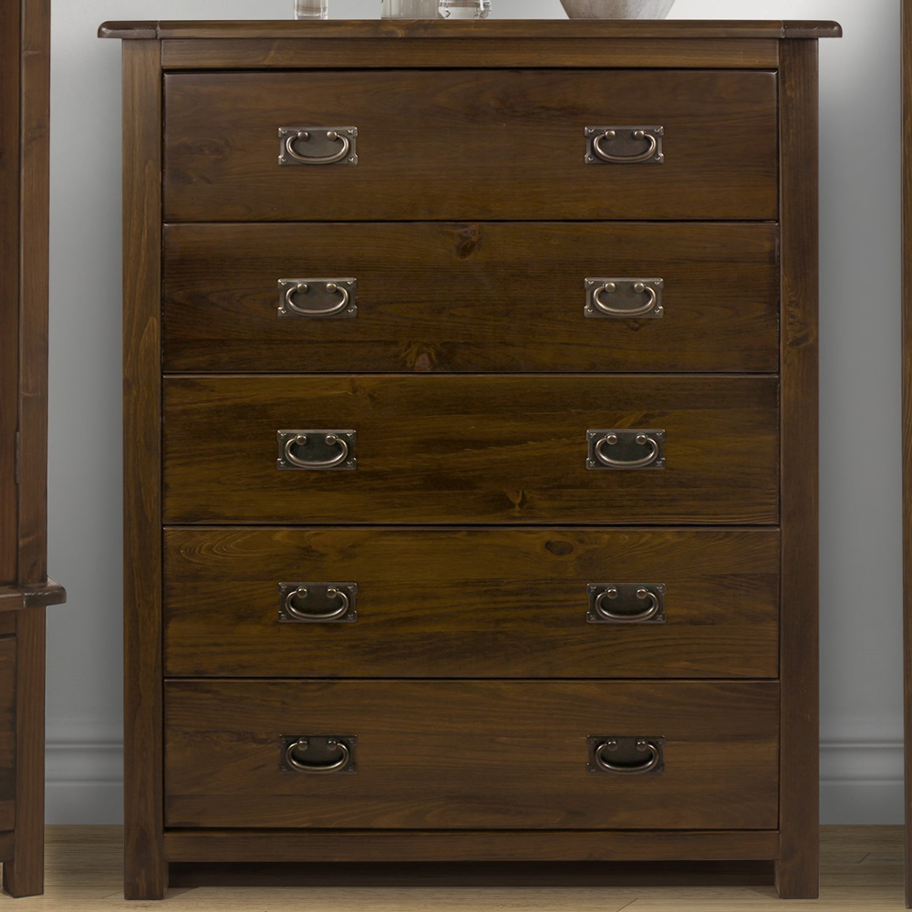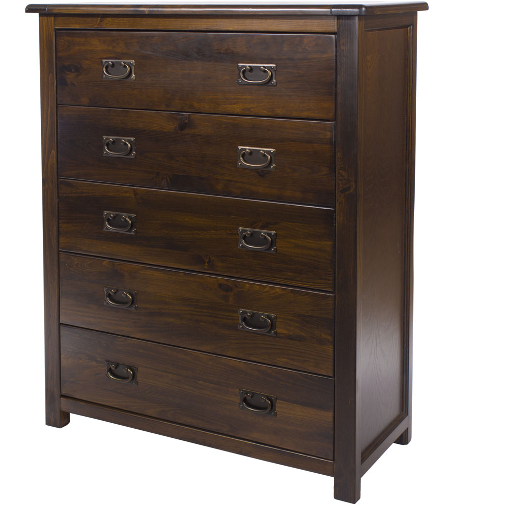 Elevate your bedroom storage with the Boston 5 Drawer Chest. This elegant piece boasts a deep, rich brown hand-finished stain with a subtle sheen, reminiscent of classic handcrafted furniture. The 25mm thick top, crafted from carefully selected timber with an inset veneer panel, provides a luxurious feel. Its colonial design is enhanced by a dark lacquer finish and antique brass drop pull handles. Five generously sized drawers offer ample space for folded clothing, each fitted with safety stops for peace of mind. The spacious top surface is ideal for displaying cherished photos, a mirror, or personal items. Responsibly sourced wood and an environmentally friendly water-based finish ensure both quality and sustainability. Designed for effortless assembly, all necessary fittings are included.