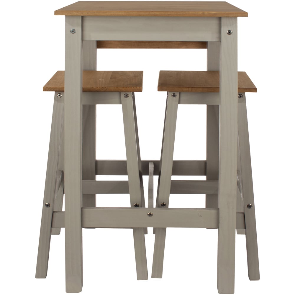 Elevate your breakfast or dining experience with the Corona 2 Seater Drop Leaf Breakfast Table Set. This stylish set, in a sophisticated Linea Grey finish, offers both practicality and charm. The high table and two accompanying high bar stools provide ample seating, with the stools tucking neatly under the table when not in use. Need extra space? Simply extend the table's handy drop leaf. The antique wax finish highlights the natural beauty of the pine wood, showcasing its grain through a contrasting grey wax on the legs and frame. Easy to clean and maintain, this modern set seamlessly blends simplicity and functionality, perfect for kitchen or dining room.