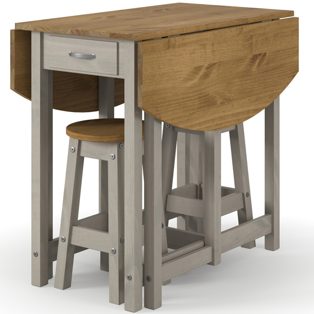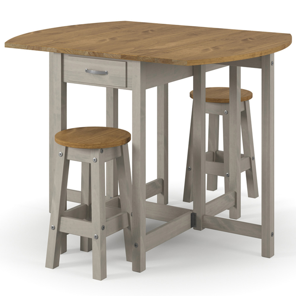 The Corona 2 Seater Oval Breakfast Table Set in Grey offers a space-saving solution for elegant dining. Its compact gateleg design features a soft oval table with two drop leaves, extending the dining space as needed. The leaves can be used together or separately, and conveniently stored away when not in use. Crafted from responsibly sourced pine with a grey wax finish and contrasting antique wax tops, this charming table includes an inbuilt drawer. The set comes complete with two high stools, with additional stools available separately. Easy assembly, cleaning, and use complete this practical and stylish piece.