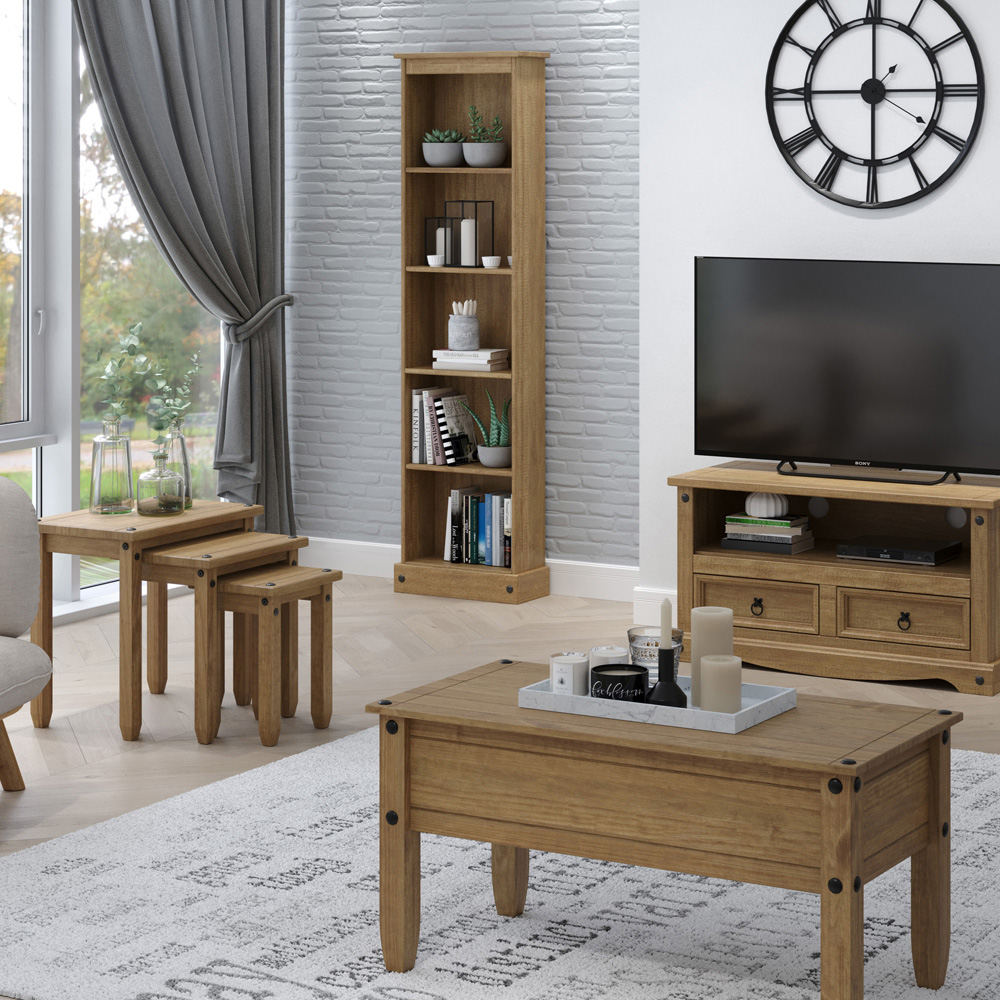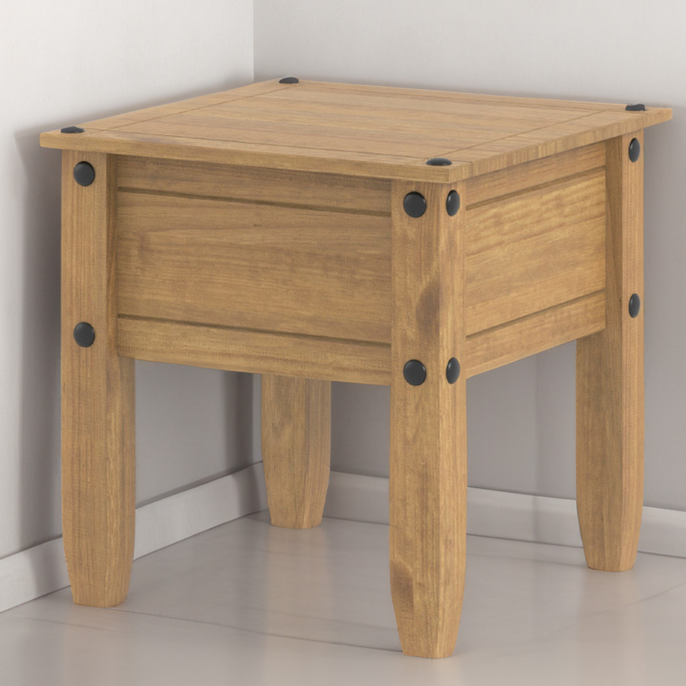 Enhance your living space with the Corona Antique Pine Lamp Table. Crafted from solid wood and finished with an antique wax for a touch of timeless elegance, this piece boasts a 16mm thick tabletop detailed with black studs and a substantial, chunky leg design. Perfect for a corner, bedside, or wherever you need a surface for lamps, books, or remotes, this versatile table offers both style and practicality.
