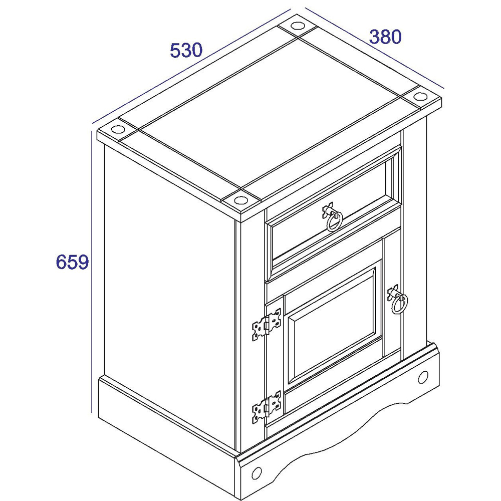 Enhance your bedroom's style and storage with the Corona Single Door Single Drawer bedside cabinet. Crafted from solid pine with an antique wax finish, this charming piece offers a drawer and a spacious cupboard, perfect for smaller bedrooms. Black hardware and drop ring pull handles add a touch of elegance. The door's hinging is easily reversible for left or right-hand opening, adapting seamlessly to your space. Simple assembly is ensured with detailed instructions and all necessary fittings included. Maintain its beautiful finish with occasional waxing. Use it as a bedside cabinet, end table, or side table – the Corona is versatile enough to suit your needs.