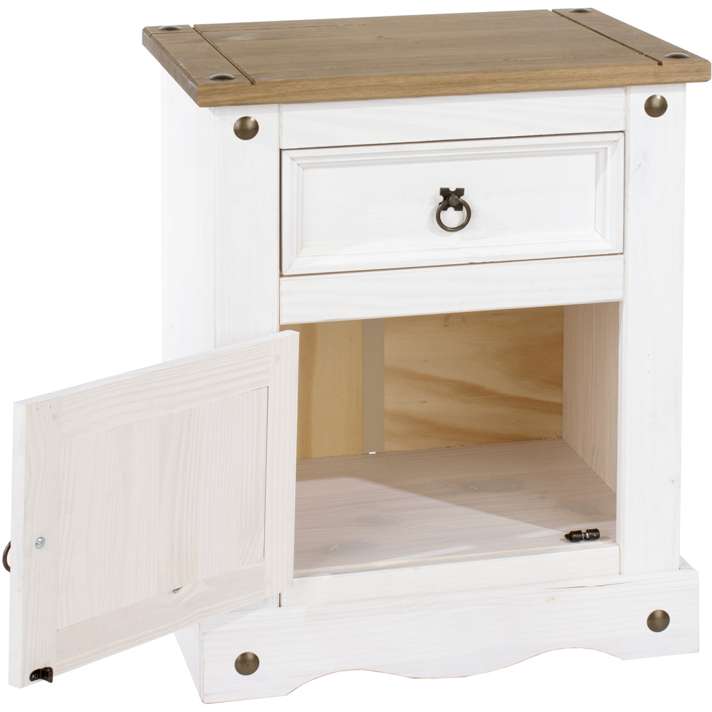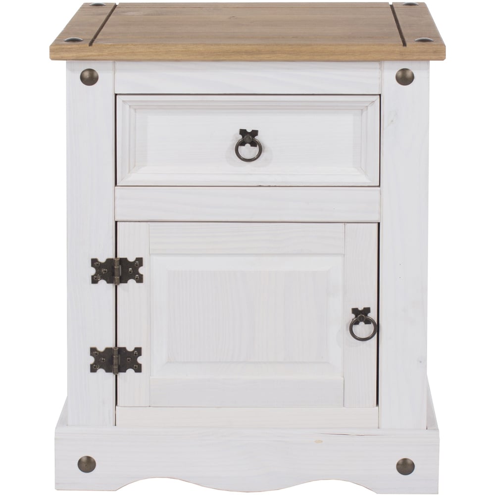 Enhance your bedroom's style and functionality with the Corona Single Door Single Drawer White Bedside Cabinet. This elegant piece offers ample storage with a spacious cupboard and a convenient drawer, perfect for keeping bedside essentials such as books and personal belongings close at hand. Crafted from pine timber and boasting a white waxed body with a contrasting antique top, its refined aesthetic is further complemented by antique brass coloured studs, hinges, and drop ring pull handles. The door is easily reversible, hinging to either the left or right. Simple to assemble with a detailed instruction guide and all necessary fittings included. Maintain its pristine look with occasional waxing.