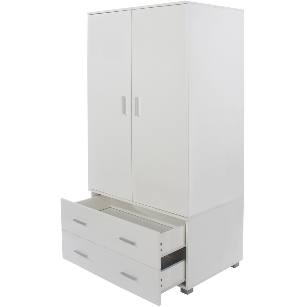 Upgrade your living space with the Lido Low Wardrobe. Its modern design complements any interior, and the smooth, gloss white finish is both durable and easy to clean. Offering ample storage, this wardrobe features two doors concealing generous hanging space and two drawers with smooth metal runners for effortless access. Finished with stylish matt silver handles and feet, the Lido Low Wardrobe is a chic addition to your home, providing both practicality and aesthetic appeal.