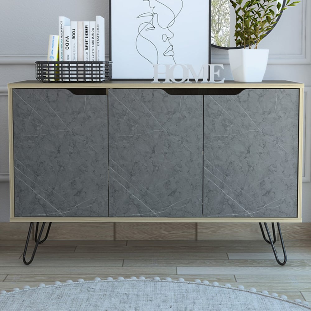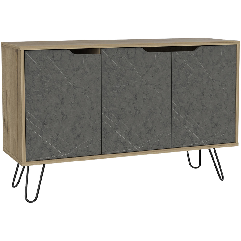 Enhance your living space with the Manhattan Medium Sideboard – a stylish addition that effortlessly blends elegance and practicality. Three doors, each featuring discreet cut-out handles, conceal ample storage for everyday essentials. The top surface provides the perfect display area for cherished photos, lamps, or decorative ornaments. Crafted from durable, easy-clean bleached pine, the sideboard boasts a sophisticated matt grey stone effect finish on its melamine doors. Attractive metal pin legs complete the design, adding a touch of modern flair. Simple step-by-step assembly instructions and all necessary fittings are included for a straightforward setup.