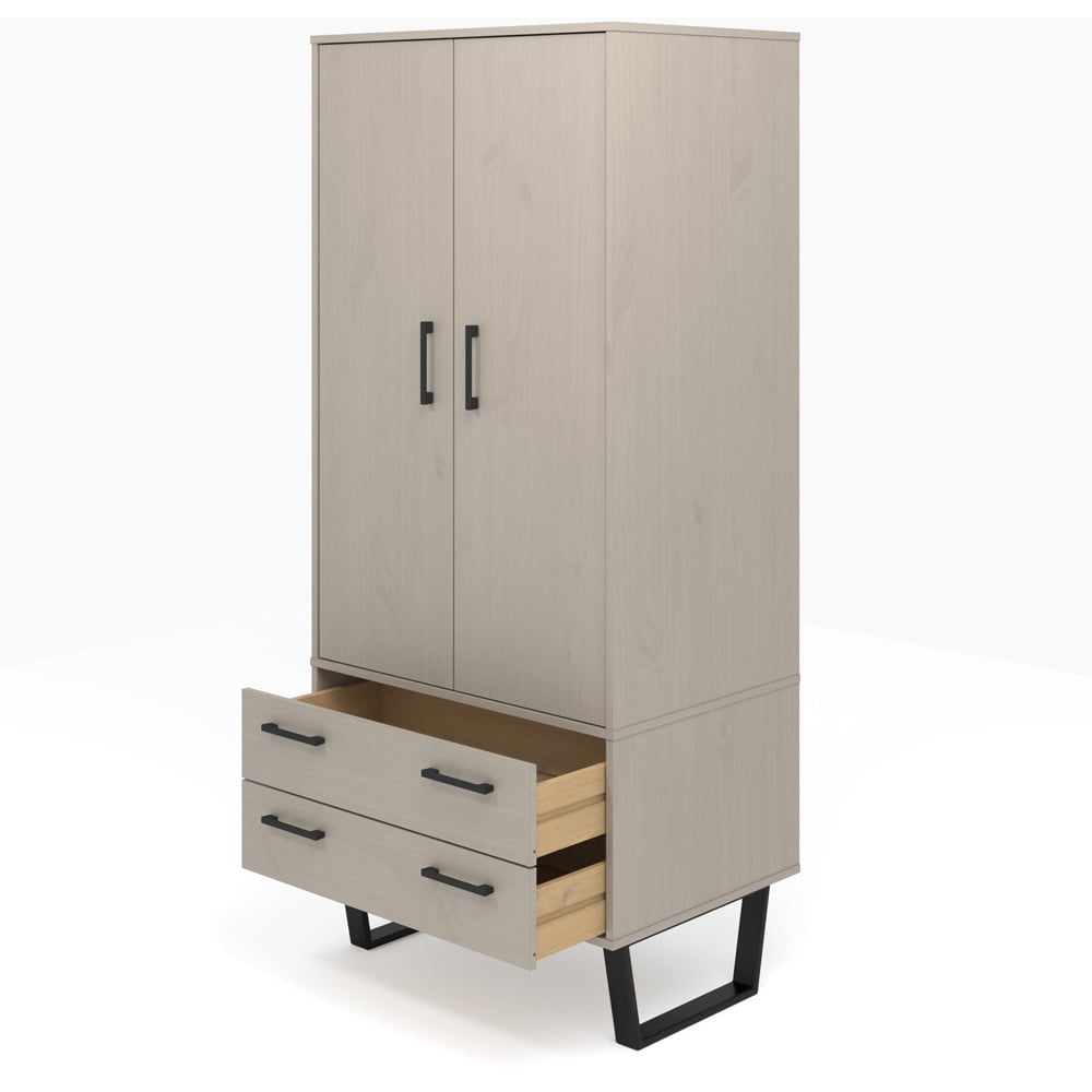 Add a touch of elegance to your bedroom with the Texas wardrobe. This piece is expertly crafted from sustainably sourced pine, showcasing a beautiful grey washed wax finish that highlights the wood's natural grain. Sturdy black painted industrial metal legs and matching pull handles complete the look. Behind two doors, you'll find ample hanging space, complemented by two convenient drawers for folded clothes. Measuring H176 x W76 x D76cm, it's a versatile storage solution for any room.