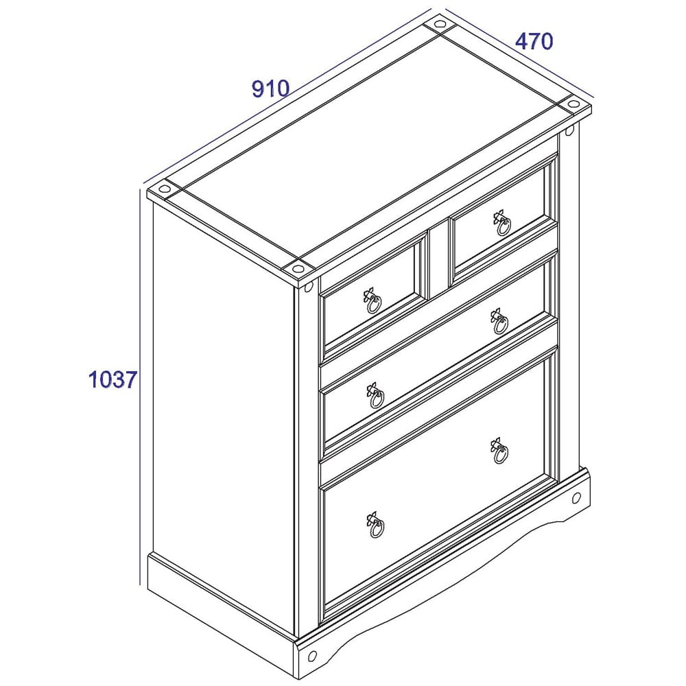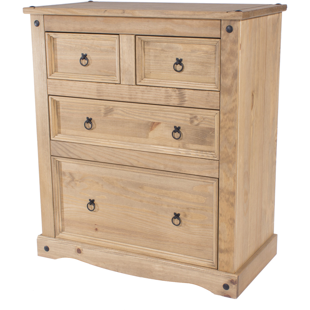 Enhance your home',s aesthetic with this Corona four-drawer chest, boasting an antique waxe finish. Crafted from pine and accented with black metal hardware and drop handles, this charming piece offers a practical storage solution. The design incorporates a deep, full-width bottom drawer, a standard-depth full-width drawer above, and two smaller drawers perfect for smaller items. Intricate skirt detailing and mouldings complete the elegant look.