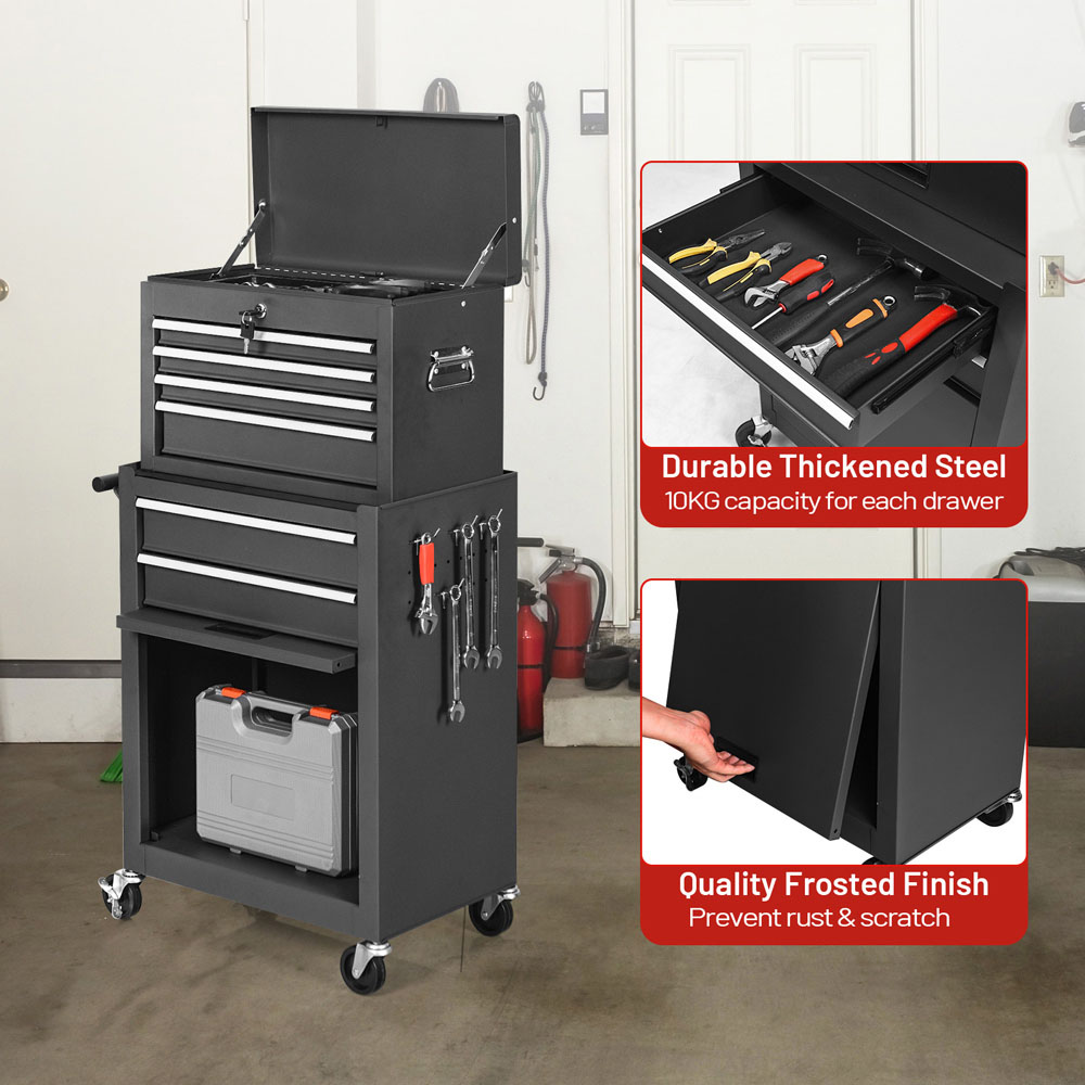 The innovative two-in-one design allows for separate or combined use of the toolbox and cabinet, adapting to your workspace layout and project needs. Constructed from robust, rust-proof cold-rolled steel, this cabinet ensures lasting durability and supports substantial weight without sacrificing performance. Smooth-rolling wheels, complete with a locking mechanism, provide easy manoeuvrability around your workspace, whilst ensuring stability when stationary. A reliable locking system offers added security, safeguarding your valuable tools.