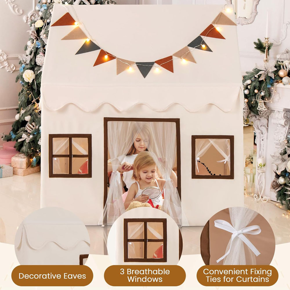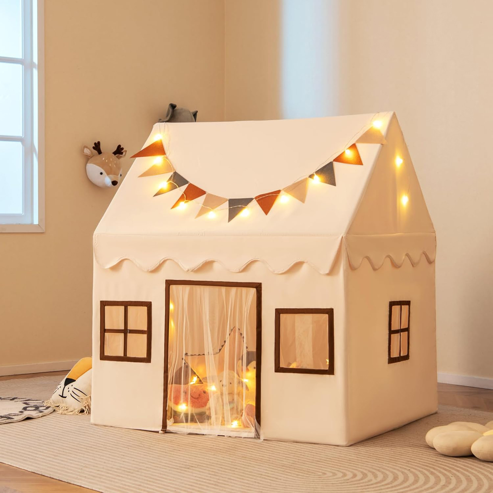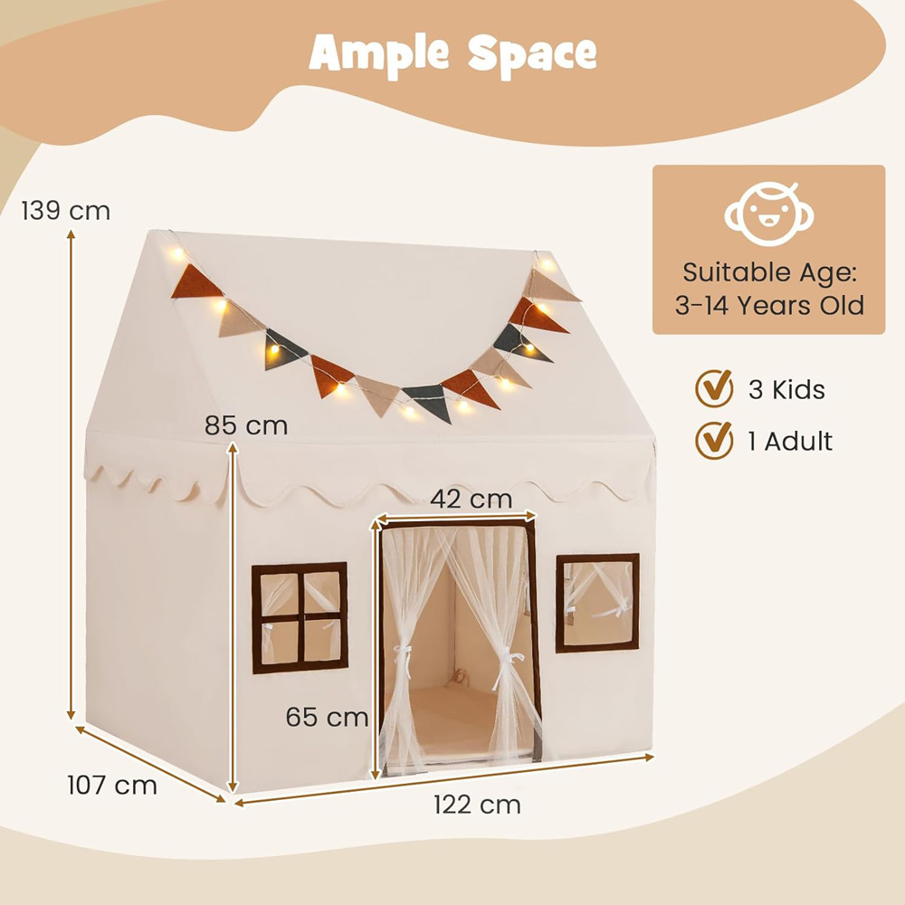 Turn playtime into a magical adventure for your little ones with this Costway Beige Playhouse Tent. Measuring 122 x 107 x 139cm, it provides plenty of space for up to three children to enjoy creative fun together. The included non-slip mat ensures a safe and comfortable play zone, while the mesh door curtains and windows offer great airflow and easy access. Thoughtfully designed with charming details like cute windows, bright string lights, and colourful pennant flags, this tent creates the perfect cosy retreat for reading, playing, or bonding time. Lightweight and easy to set up, it’s just as ideal for indoor play as it is for outdoor celebrations, from picnics to movie nights.