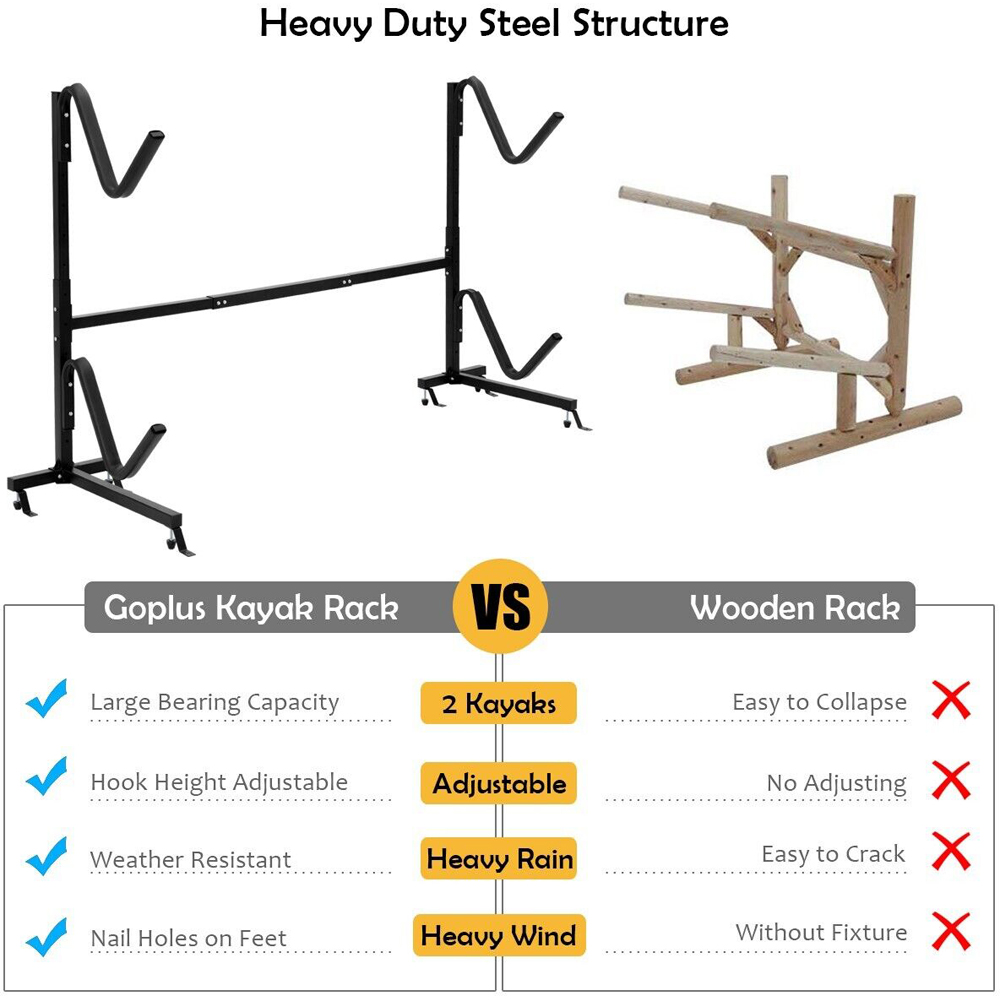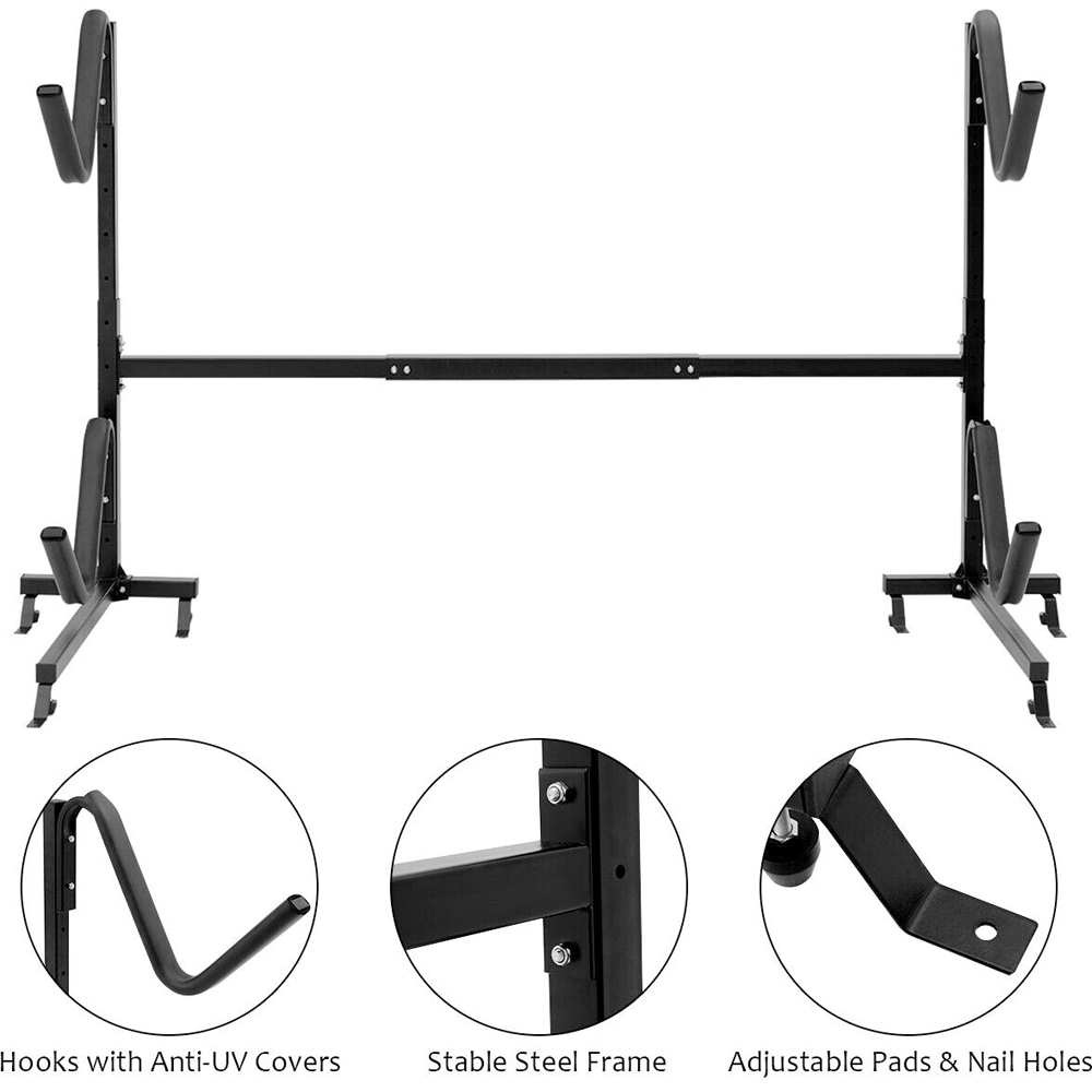 Maximise your water sports gear storage with the Costway Freestanding Dual Storage Rack. An excellent choice for safely storing up to two kayaks, SUPs or canoes, this durable rack is constructed from robust, heavy-duty steel pipes. Finished with a powder coating for enhanced corrosion and rust resistance, it’s built to last. The design incorporates two removable hooks adjustable to six positions, making it suitable for diverse sizes and shapes. Complete with anti-UV hook covers to prevent scratches and adjustable foot pads for stability, this versatile rack is ideal for indoor and outdoor use in your garage, boathouse or on the dock.