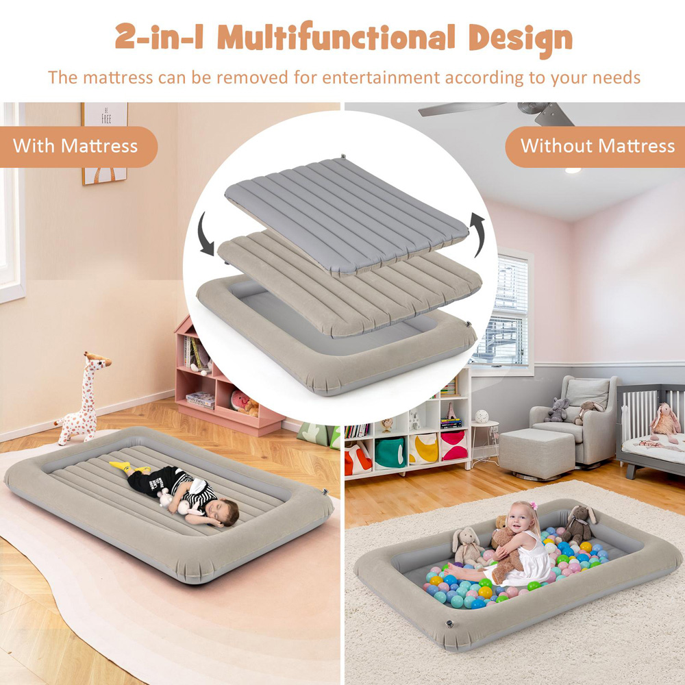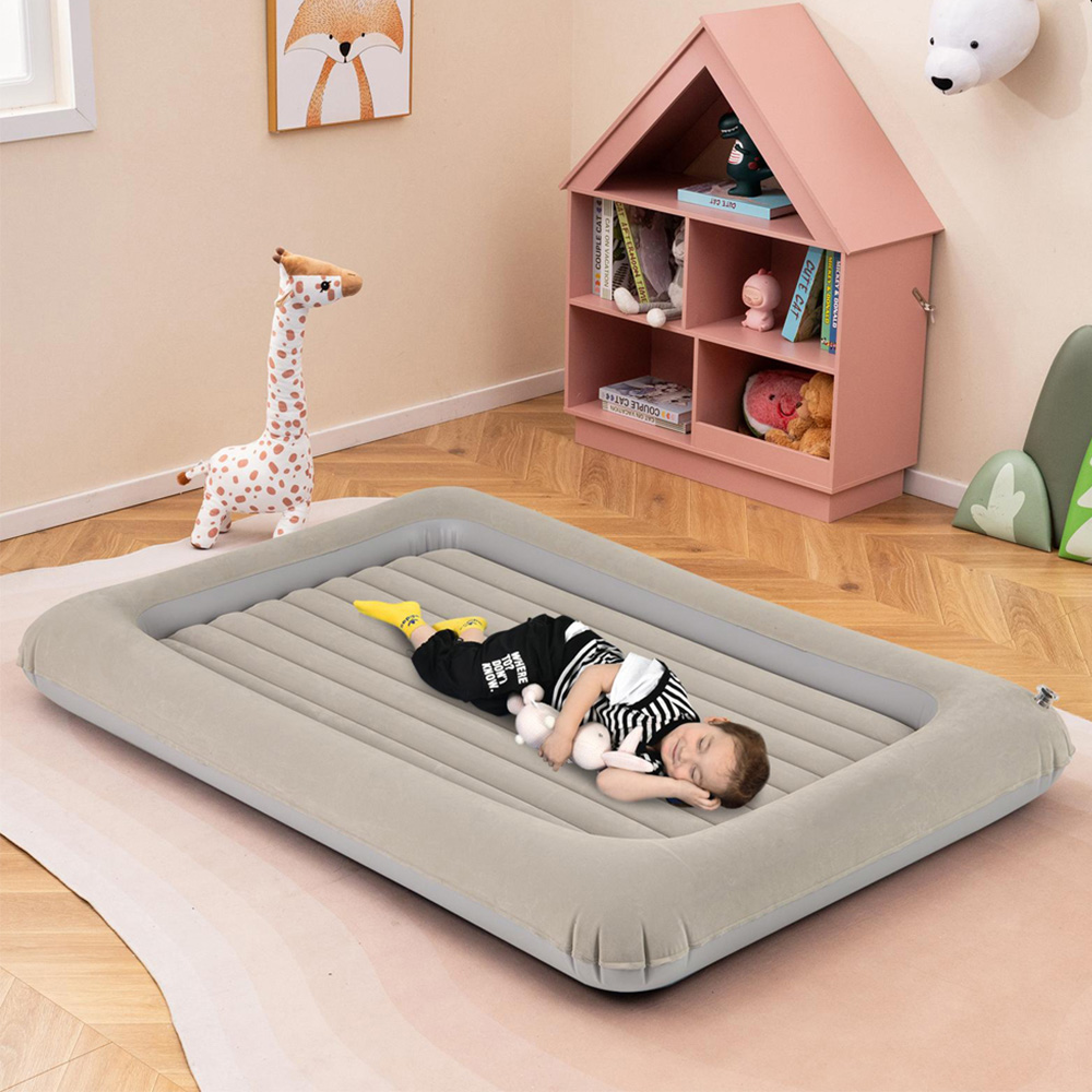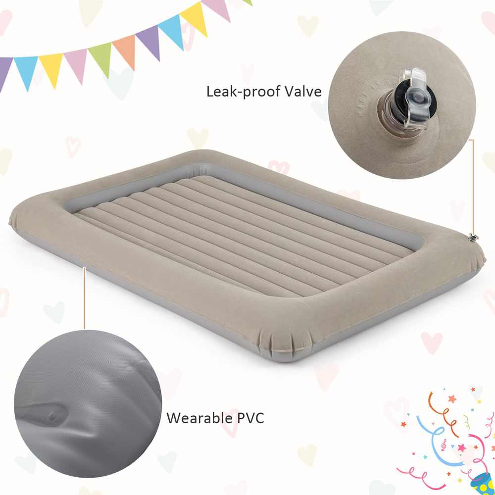 Make traveling and sleepovers easy for little ones with this portable Costway Grey Inflatable Travel Bed, designed for comfort and convenience. The double-sided mattress offers a soft flocking surface for cosy sleep and a durable PVC side for play, making it perfect for any situation. With the press-proof mattress seamlessly tucked into the bed, stability and safety are ensured. The electric pump with three interconnected nozzles allows quick inflation in just 30 seconds, while the storage bag and repair patches keep everything tidy and ready for transport. Whether used at home, on a road trip, or as an extra bed, this inflatable mattress provides a safe and snug sleeping space for little ones.