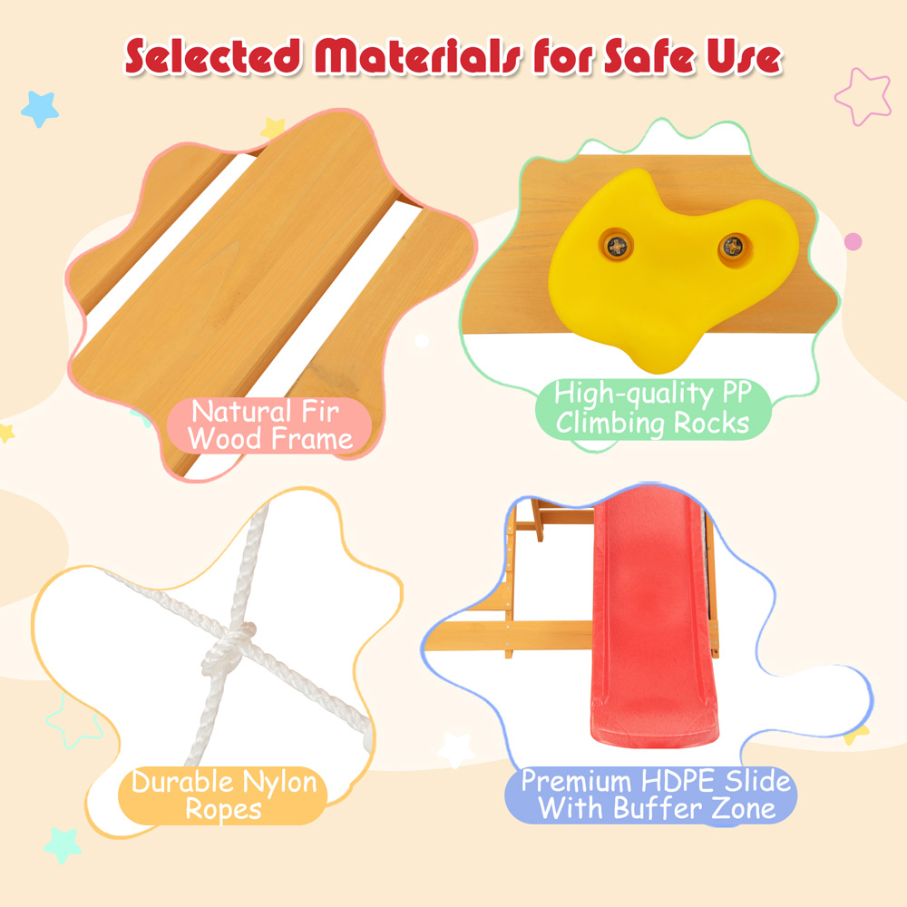 Let children climb, slide, and explore with the Costway Kids 5 in 1 Jungle Gym with Slide and Rock Climbing Wall. Made from strong, natural fir wood, this playset is sturdy enough to hold up to 200kg, giving children aged three to eight safe and exciting space to play and grow. It features a five-in-one design that includes a top seat, a climbing rope, a crawling rope, and a crawling tunnel. Plus, it comes with two removable door curtains for extra fun. Every detail is built for active children, from the easy-to-grip climbing rocks and thick ropes to the smooth, burr-free surfaces and firm connections. Whether placed in the living room, children’s room, or preschool, it makes a great Montessori-style gift that helps develop motor skills, coordination, confidence, and social skills. Use it indoors or outdoors, but be sure to bring it inside when not in use. Assembly is simple with the included easy-to-follow instructions. Please note that parental supervision is recommended during play.