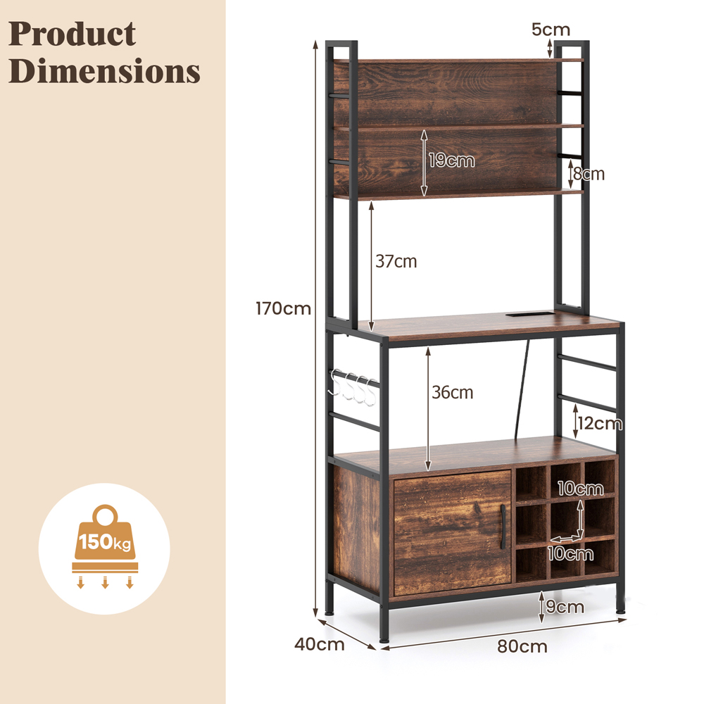 Optimise your kitchen storage with this Costway Redding Brown Bakers Rack with Power Outlet. Featuring open shelves, a spacious cabinet, hanging hooks, and dedicated wine bottle holders, it offers ample room for cookware, appliances, and essentials. The built-in UKCA certified power outlet, equipped with 2 AC outlets and 2 USB ports, allows seamless charging for kitchen devices and electronics. Constructed with a sturdy, anti-rust metal frame, it ensures long-lasting durability, while adjustable foot pads and anti-toppling devices provide added stability and safety. With a modern and elegant design, this multipurpose rack effortlessly blends style and functionality, making it perfect for kitchens, dining areas, and living spaces.