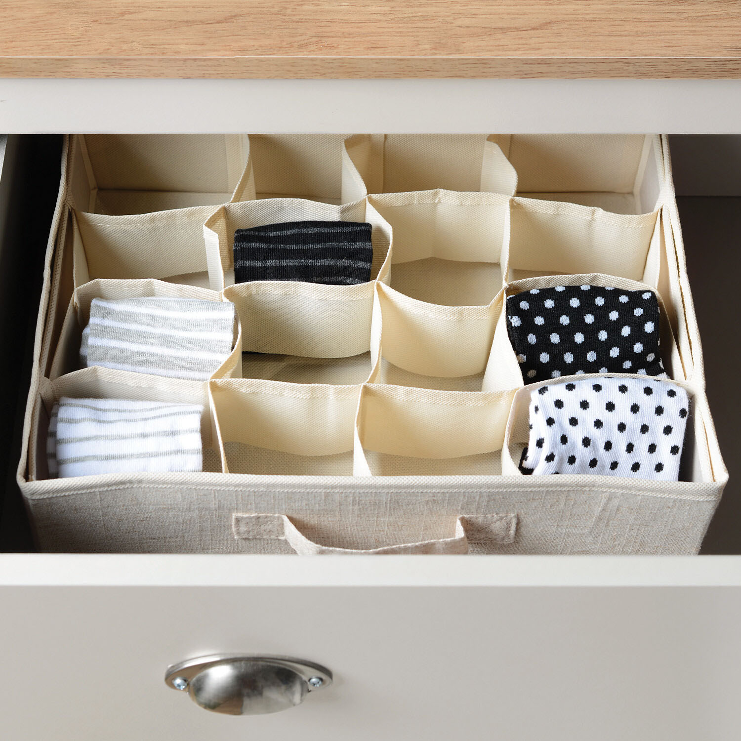 Drawer organisation sorted. Introducing the Sock/Brief Organiser. This elegant organiser features sixteen individual compartments, perfect for neatly storing socks, underwear, ties, and other accessories. Keep your drawers tidy and easily accessible. Its linen finish with contrasting piping complements any décor.