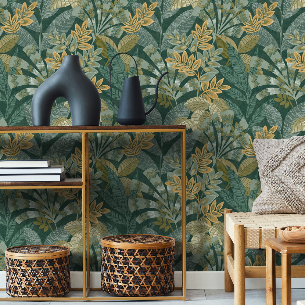 Crown Asha Leaves Lush Green Wallpaper adds sophistication and luxury to any room. Lush exotic leaves create a striking design against a vibrant background. Intricate hand-painted detailing and a textural fabric effect bring this secret garden to life, adding warmth and depth to your space.