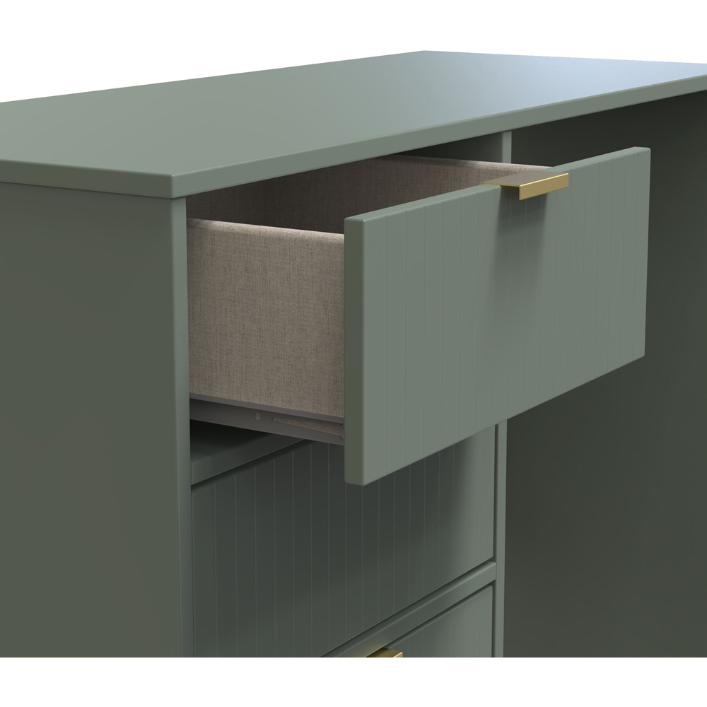 Add a touch of sophisticated style to your bedroom or home office with the Crowndale dressing table. Its unique "Linear" patterned drawer fronts, in a calming reed green finish, offer a distinctive look. This high-quality piece, crafted in the UK, boasts four drawers with smooth metal runners and gold metal handles, complemented by elegant gold hairpin legs. The scratch-resistant finish ensures lasting beauty. Delivered fully assembled (though legs may be detached for transit) by a two-person team, this vanity and desk combination provides both practicality and charm.