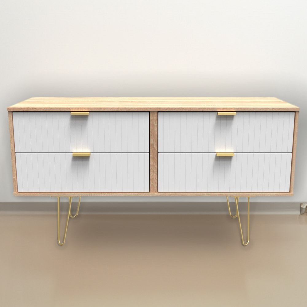 Elevate your home's aesthetic with the Crowndale four-drawer chest. This stunning piece boasts a sophisticated white matt finish complemented by a rich Bardolino oak top, showcasing a unique "Linear" pattern on the drawer fronts. Ideal as a bedroom chest or a stylish low-level media unit, its practicality is matched only by its beauty. The four drawers glide smoothly on metal runners, accented by elegant gold metal handles and supported by fashionable gold hairpin legs. Crafted in the UK from high-quality materials, this fully assembled chest (legs may be detached for transit) is delivered directly to your door by a two-person team, ensuring a seamless and damage-free arrival. Experience the perfect blend of form and function.