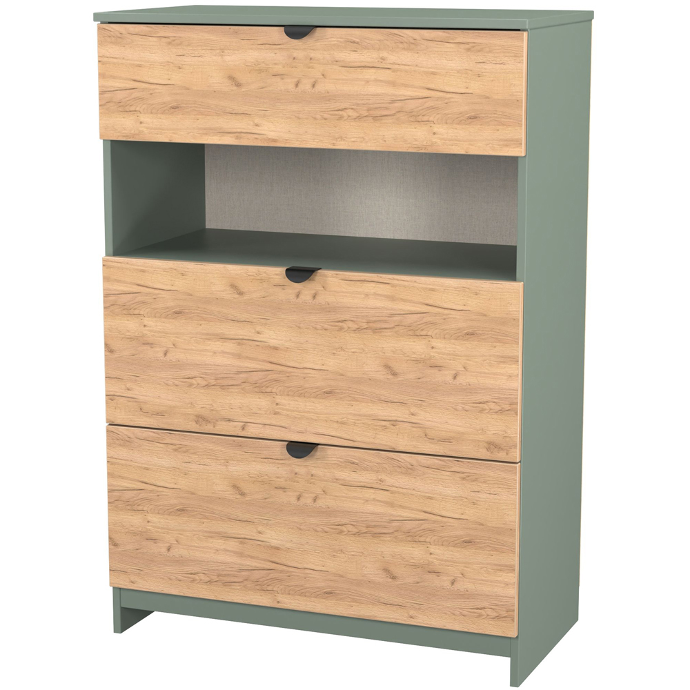 Crowndale Bora Gold Oak and Reed Green 3 Drawer Single Shelf Deep Chest of Drawers