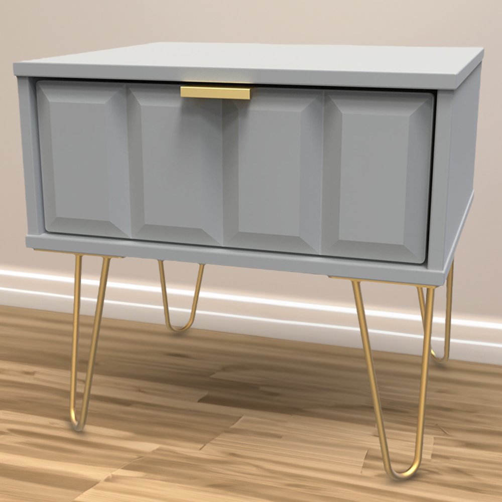 Elevate your bedroom',s aesthetic with the Crowndale Cube bedside table. Its charming dusk grey finish and stylish cube silhouette create a sophisticated look. Gold metal handles and hairpin legs add a touch of glamour, while the single drawer provides convenient storage for bedside essentials. A perfect blend of form and function for a truly stylish bedroom.