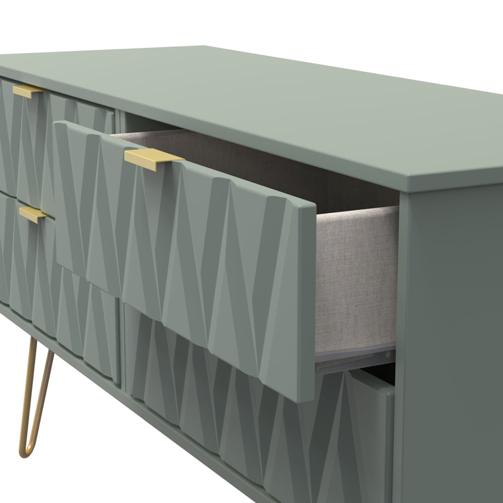 Elevate your home',s style with the Crowndale Diamond four-drawer chest. This spacious storage solution, perfect for any room, boasts a sophisticated reed green finish and distinctively patterned drawers. The smooth metal runners and lined drawers ensure effortless use, while the generous tabletop makes it ideal as a low-level TV stand, accommodating TVs up to 50 inches. Finished with elegant gold metal handles and sturdy hairpin legs (easily removable for transit), this piece adds a touch of contemporary chic to any interior.