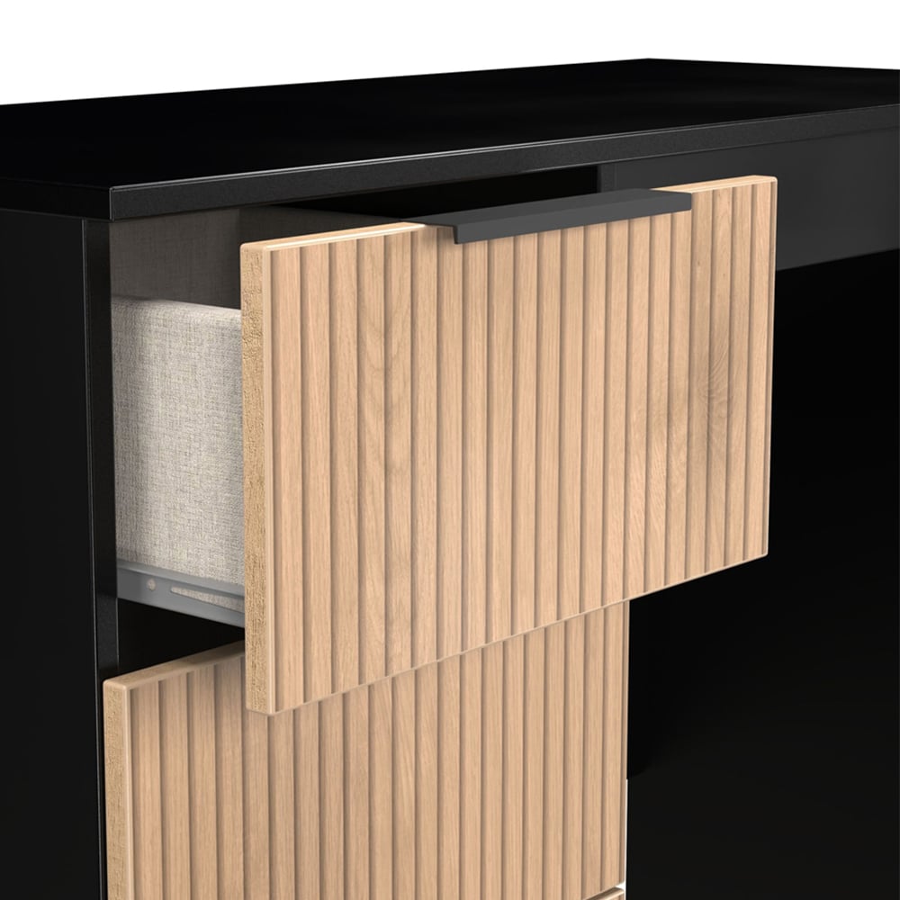 This narrow three-drawer desk or vanity unit offers a practical storage solution for bedrooms and offices alike. Its sleek design blends simple elegance with modern styling, featuring a striking slatted front, robust black metal handles, and smooth-gliding metal drawer runners. A matching stool and mirror are available separately to complete the look. Crafted in the UK to exacting standards, this piece is delivered fully assembled (though legs may be detached for transit) by a two-person delivery team directly to your chosen location.