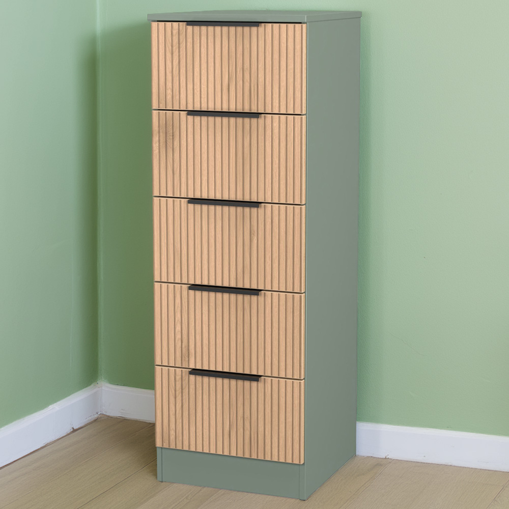 Crowndale Java Slatt Effect and Reed Green 5 Drawer Tall Chest of Drawers