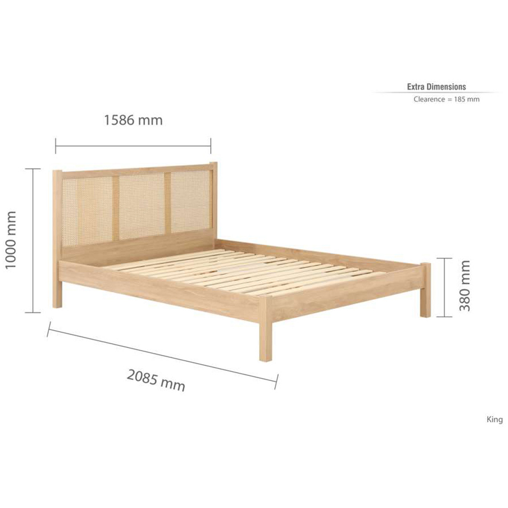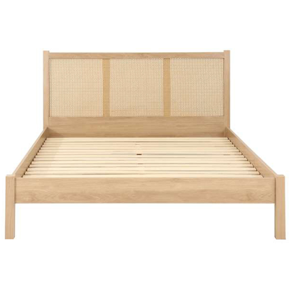 Make a statement with the Croxley king-size oak and rattan bed. Its beautifully crafted rattan headboard brings a touch of sunshine to any bedroom. Classically styled, it complements both traditional and contemporary interiors seamlessly. The sturdy wooden slats provide excellent mattress support and airflow. Enjoy a naturally airy feel by day, transitioning to warm, cosy tones at night. Please note: this bed is designed for UK standard-size mattresses only, with a maximum recommended mattress height of 200mm.