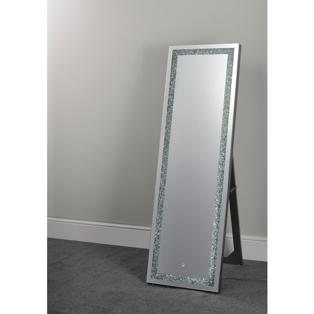 This full-length freestanding mirror makes a glamorous statement with its crystal-encrusted border that beautifully glistens. The bright white LEDs provide illuminating functionality, easily controlled by a sleek touch switch. A perfect blend of opulent style and practical design, it will add a touch of sparkle to any corner of your room.