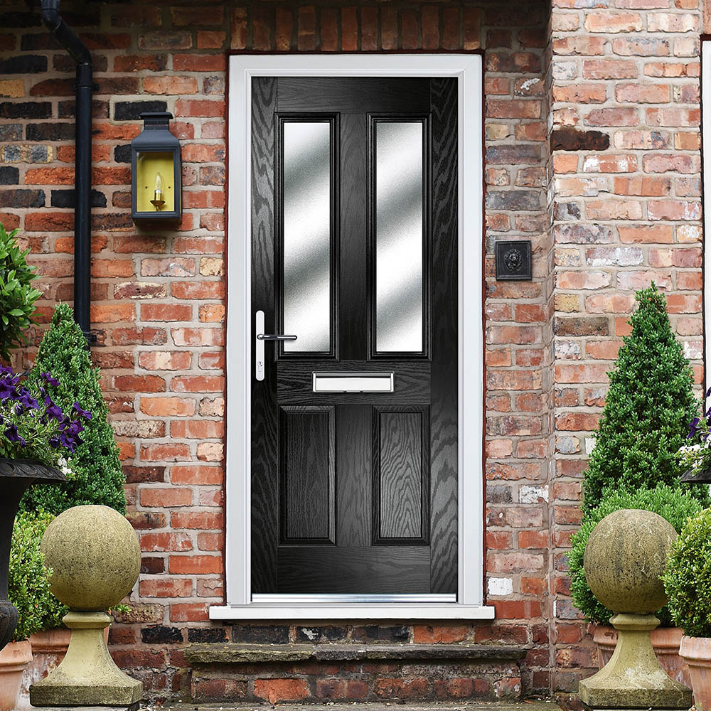 Enhance your home's entrance with this stylish and efficient black composite door. Its sleek black exterior complements a variety of architectural styles, while the durable GRP skin and polyurethane foam core provide lasting quality and weather resistance. The double-glazed, toughened safety glass, featuring two obscure glass panes, offers both privacy and natural light. High-security hook locks and an included handle add peace of mind, further enhanced by the integrated PVC grill. Designed for a right-hand opening, this door measures 920 x 2055mm. A perfect blend of form and function for your home.