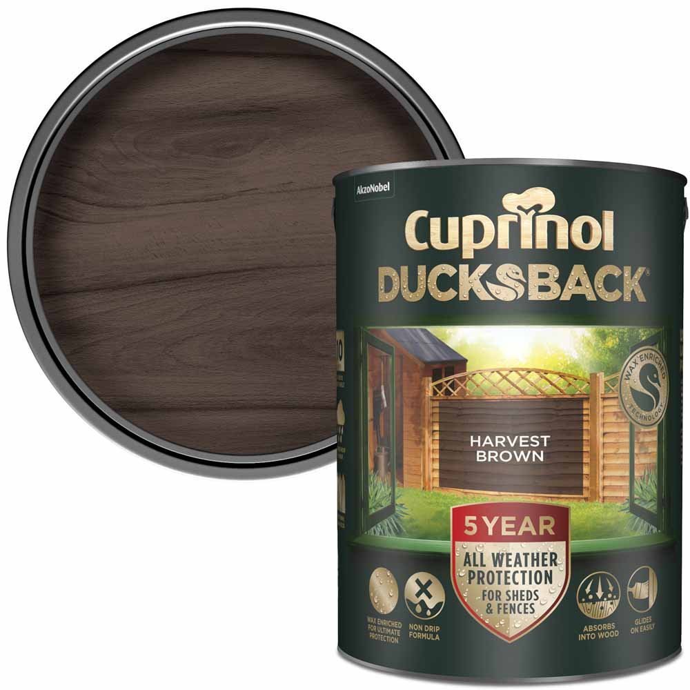 Cuprinol Ducksback Exterior Wood Paint 5 litre in Harvest Brown has an advanced wax-enriched formulation that colours and weatherproofs sheds, fences and rough-sawn garden wood for up to 5 years. It's quick-drying, low odour and safe to use around plants and pets. Provides up to 30 square metres of coverage per 5-litre can or 10 fence panel sides. Apply by brush or roller - 2 to 4 hours drying time.