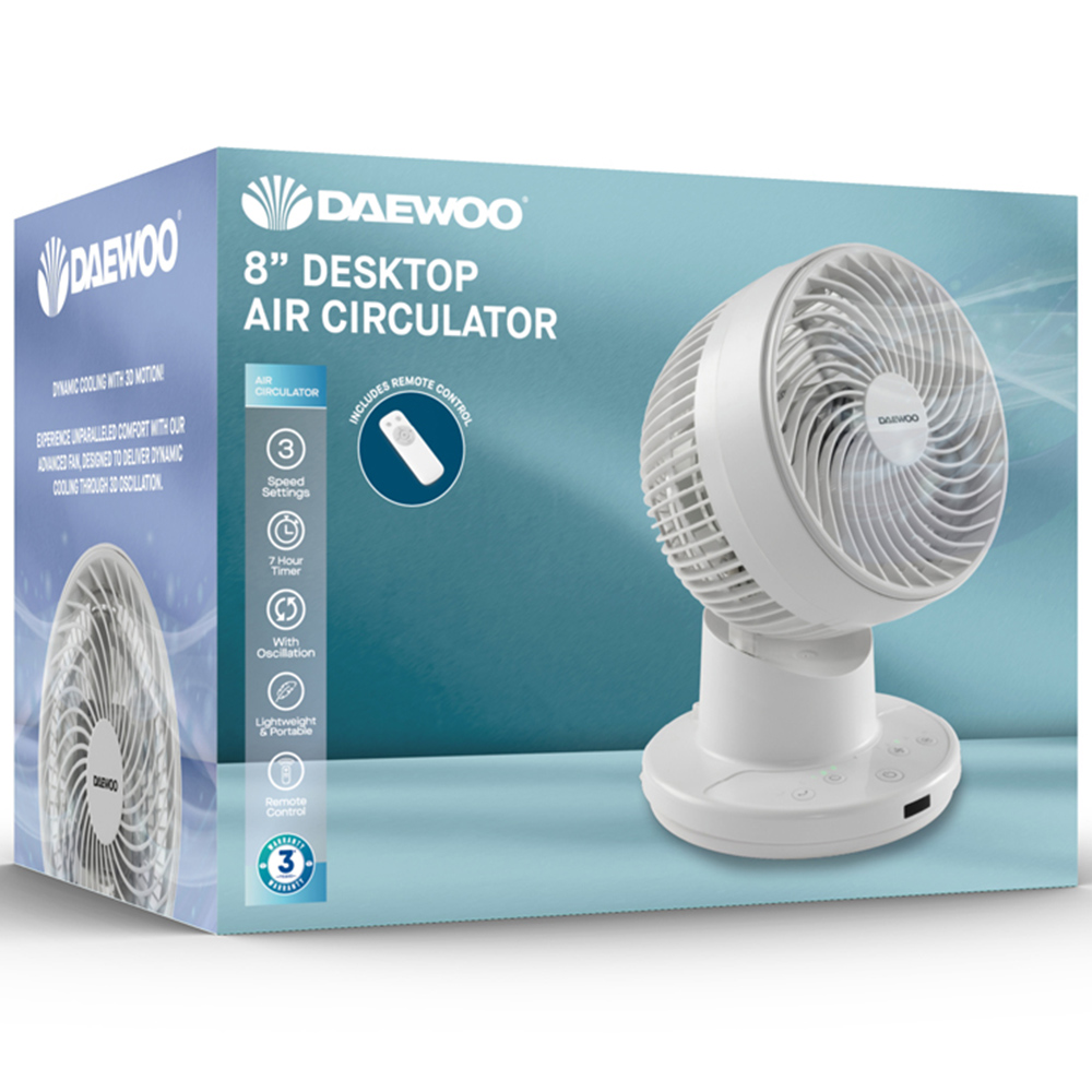 Stay cool and comfortable all summer long with this Daewoo Air Circulator. This fan features 3D oscillation with a dynamic 85-degree horizontal and vertical motion, delivering a refreshing breeze up to 6m away. You can enjoy customisable comfort with 3-speed settings, while its portable design allows for effortless movement between rooms. The built-in timer offers up to 7 hours of continuous cooling, adjustable in 1-hour increments, with an auto shut-off for convenience.