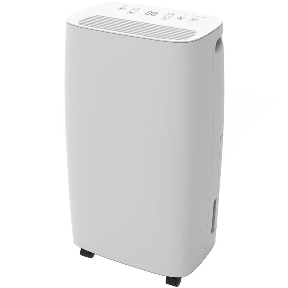 Enjoy a comfortable home environment with the Daewoo 12L Dehumidifier. This compact unit effectively removes excess moisture, preventing mould, mildew, musty odours, and condensation. Its electronic soft-touch controls offer convenient operation, with two selectable fan speeds for tailored humidity management in rooms up to 15m². Features include auto defrosting, auto-restart, and a water-full alarm. Designed for quiet operation, it won't disrupt your daily life. Effortlessly move it around your home thanks to its all-directional caster wheels. Maintain your ideal humidity level with ease.