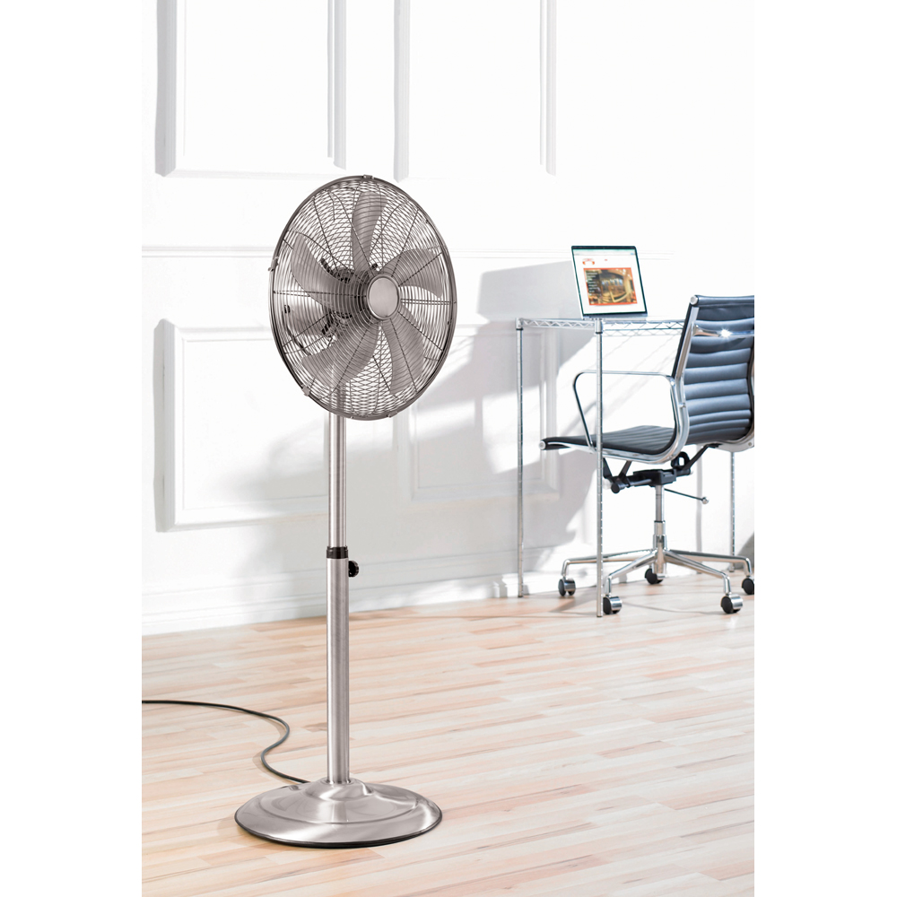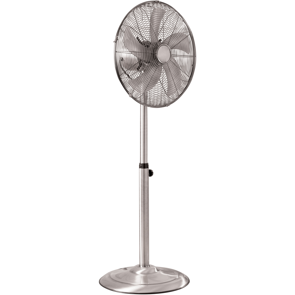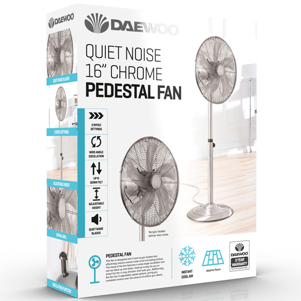 Enjoy efficient cooling with the 16-inch Daewoo Quiet Noise Chrome Pedestal Fan. Three speed settings let you personalize your comfort, while the adjustable height, tilt, and 90-degree oscillation deliver customized airflow. A stable, anti-slip chrome base with rubber feet ensures secure placement, and the integrated carry handle provides easy portability. Quick assembly and a topple-resistant design add convenience and safety. Ideal for home or office use.