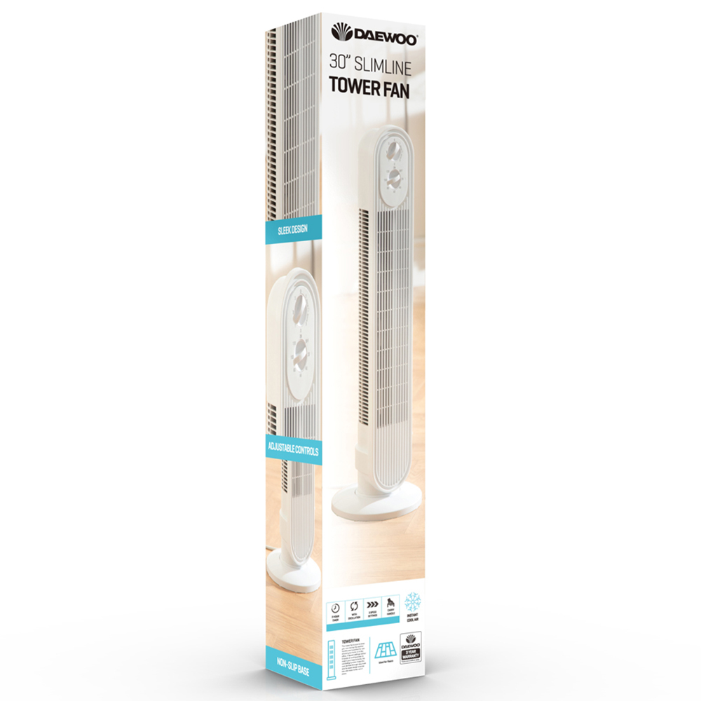 Enjoy cool comfort all summer long with the 30-inch Daewoo Slimline White Tower Fan. Three powerful speed settings let you personalize your airflow, while the oscillating feature ensures even cooling throughout the room. Its modern design complements any home or office décor.